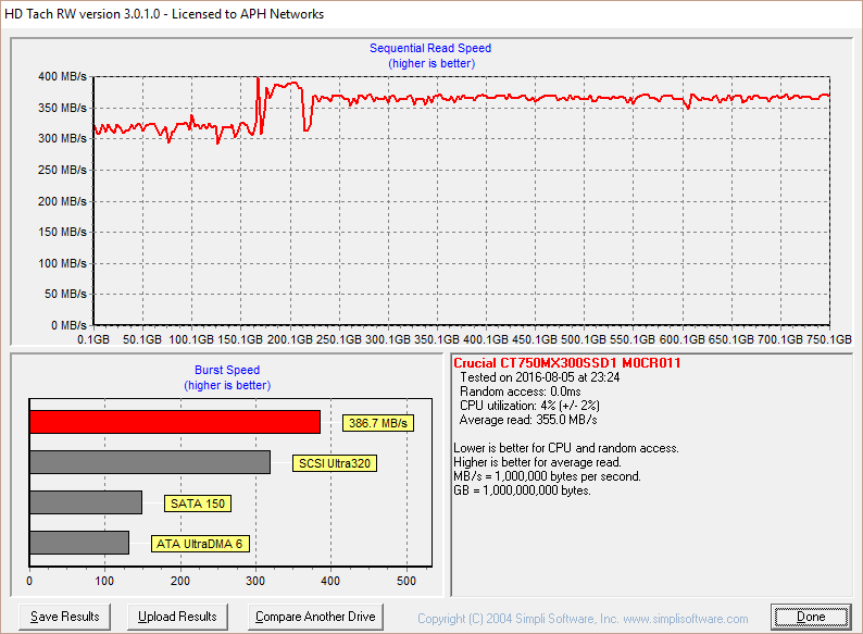 After giving the Crucial MX300 750GB a clean format and ensuring alignment and everything is correct, I fired it up for some testing in HD Tach. While HD Tach is more of a 'drag race' than a clear indication of real life performance, and has been around for a really long time, it is an excellent storage performance reference among SSDs with the same controller, and has been our favorite benchmark long before hard drives even cracked the 50MB/s mark. With an average read speed of 355.0MB/s according to HD Tach in single disk configuration, this score is decent, but nothing to write home about (The SanDisk Ultra II 240GB is the fastest single SATA 6Gb/s disk at 469.3MB/s, while the OCZ RD400A 512GB is the record holder at 1109.7MB/s). Just for reference, the MX200 posted a score of 402.8MB/s. For most solid state drives, we typically look for something that is faster than 350MB/s. From our experience, most drives do not crack the 400MB/s line. At the end of the day, HD Tach may not be the best test for solid state drives all the time, but we really cannot argue against the results.