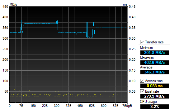 Unfortunately, HD Tune does not generate any fancy independent graph outputs in particular, so I had to edit my screenshot out a bit to make it look better for publishing in a review. Unlike our HD Tach results on the previous page, the line was a bit bumpy, but remained generally flat on average. It differs slightly in magnitude than the other program -- probably due to testing algorithms used -- but its performance characteristics are identical in practice. Other than that, the results were commendable across the range; the recorded access time was very low, as we would expect from a solid state drive. The Crucial MX300 750GB posted roughly similar results otherwise for the sequential read speed. Do keep in mind the discussion we had on the previous page, as it still applies here.