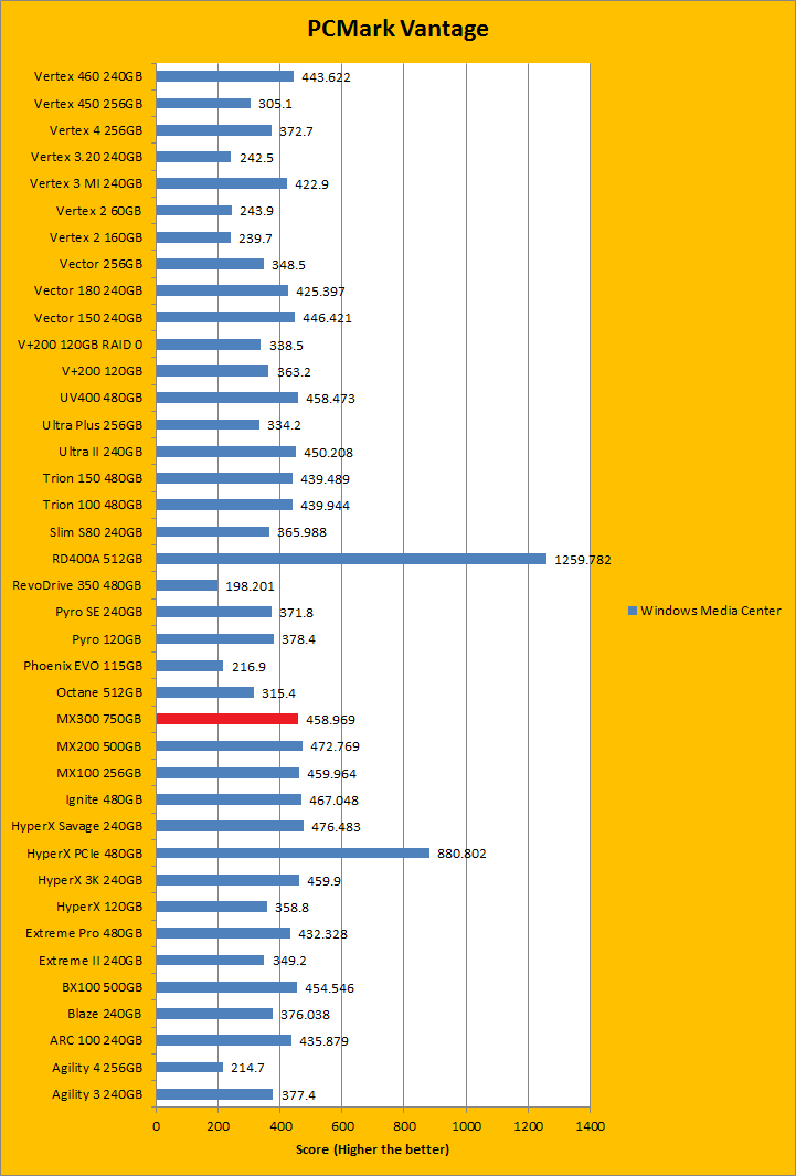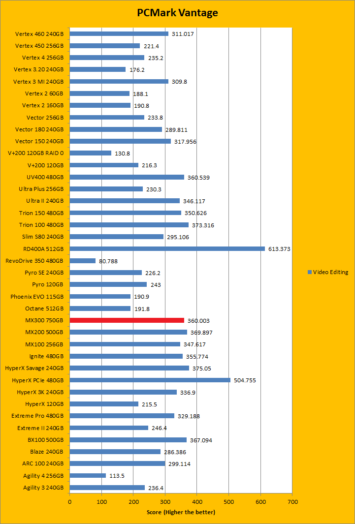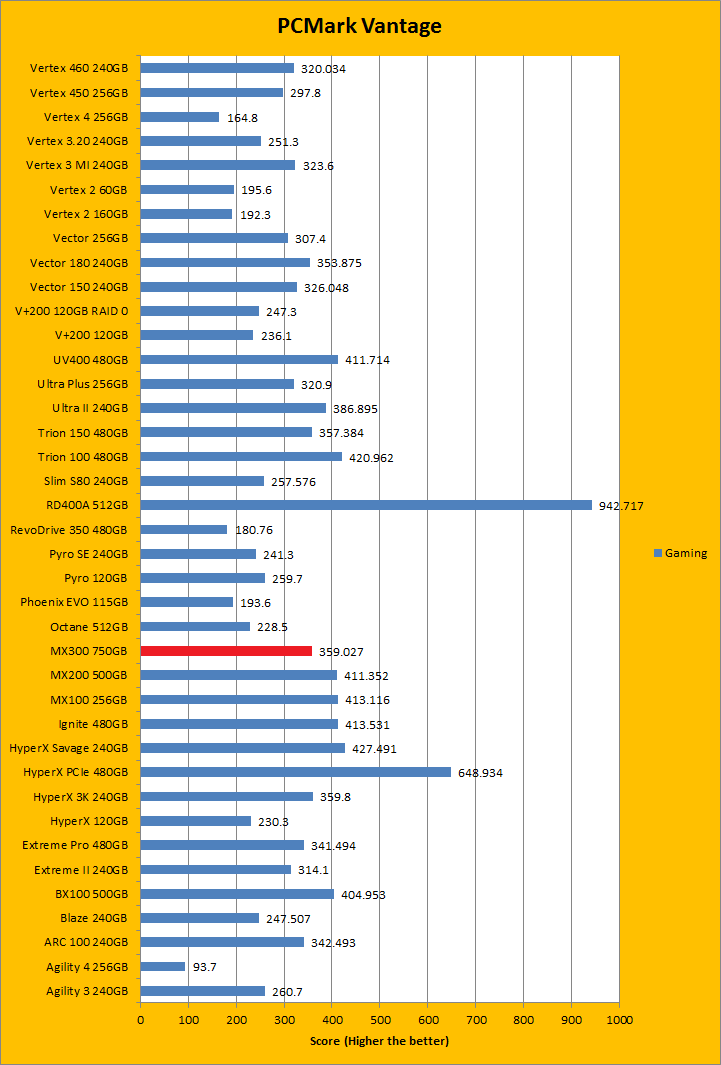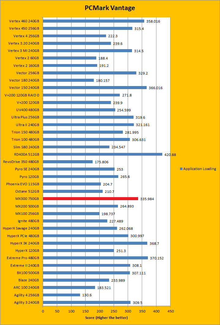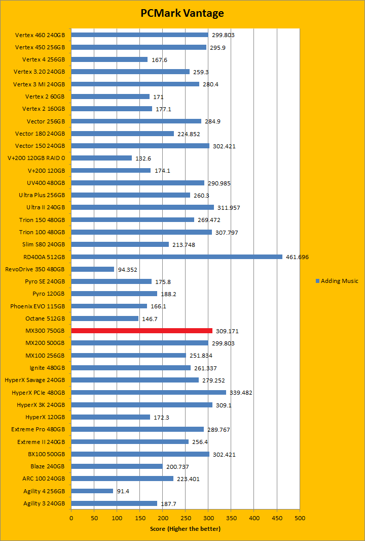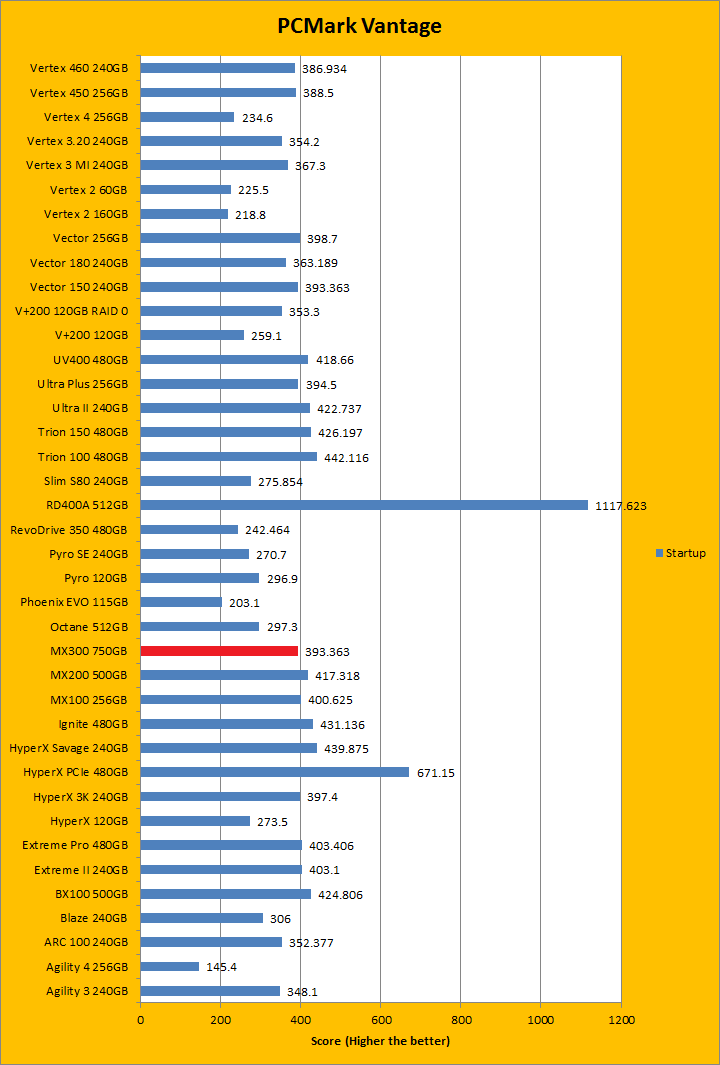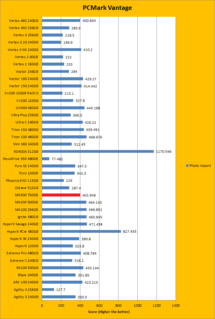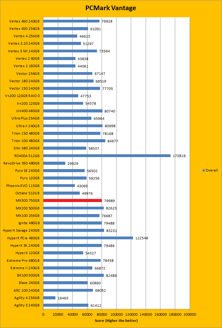 PCMark Vantage aims to shed a little more insight into real life performance of your computer hardware by semi-synthetic means -- and all insight is good, right? The great thing about standardized tests is anyone can repeat them and get very similar results, given identical hardware. Well, I am not going to narrate the stuff above in detail, because we all know graphs are there for a very good reason. Just to give you a bit of insight if you are too lazy to go through all nine comparisons, the Crucial MX300 750GB delivered an overall score among the top for a SATA 6Gb/s drive; but fell behind the MX200. PCMark Vantage uses some pretty simple simulations, so it is pretty optimized for drives with relatively fast linear read (It does funny things when you got a SandForce RAID array though). The results were pretty good. In the subcategories, the Crucial MX300 750GB was slower than its predecessor by small margins in five out of eight categories, but made it all back with a big win in the Application Loading subtest. On average, the difference was not big, and the general performance was very commendable in PCMark Vantage.