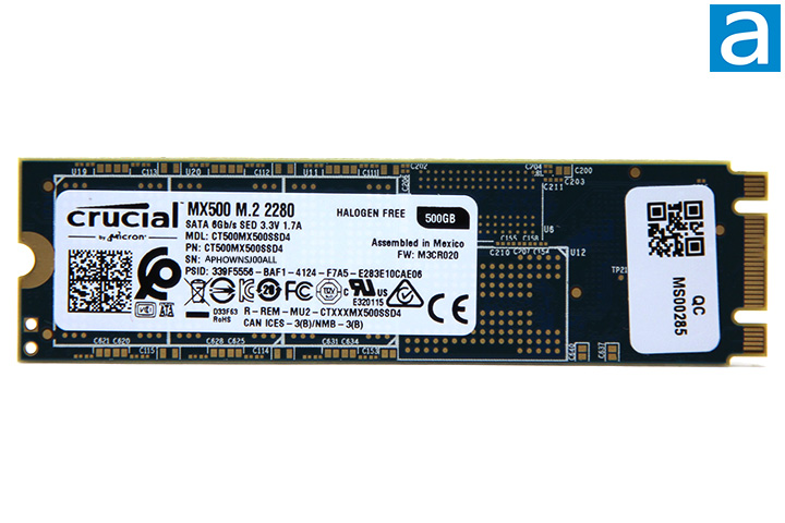 Flipping the Crucial MX500 500GB around, and you will find no components of interest. In fact, the PCB is completely blank, as all the components are located on the other side shown in our photo above. The layout is fairly simple upon closer inspection of the blue printed circuit board. A label on the SSD carries miscellaneous information such as its certification logos, brand, capacity, and serial number. Unlike many flash storage solutions we have reviewed in the past, this Crucial drive is made in Mexico like its 2.5" variant. Removing the label in question will void your five-year warranty, but there is no real reason why you need to do that, haha.