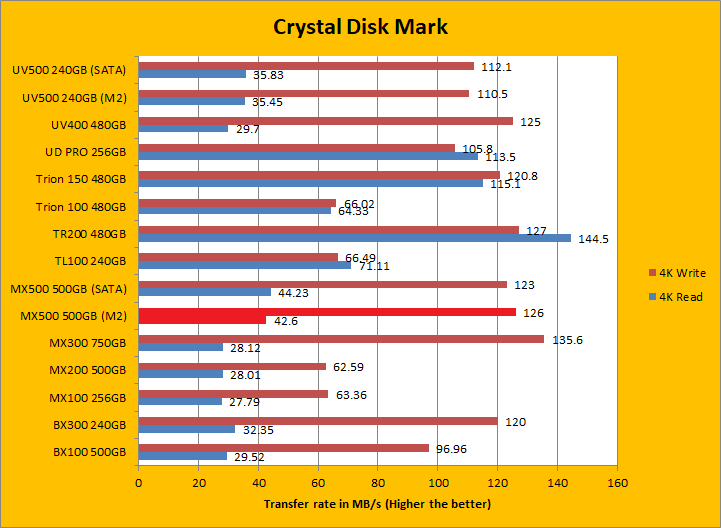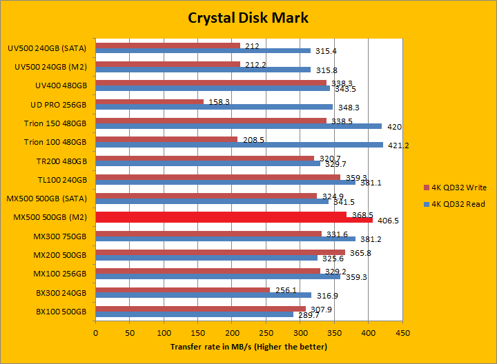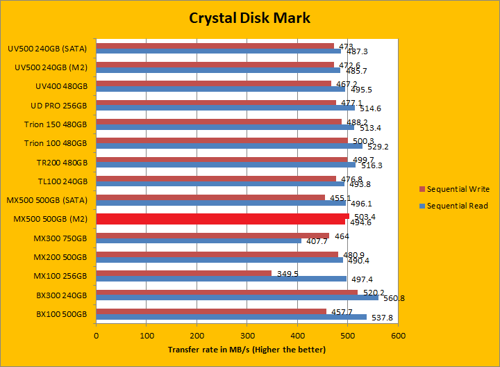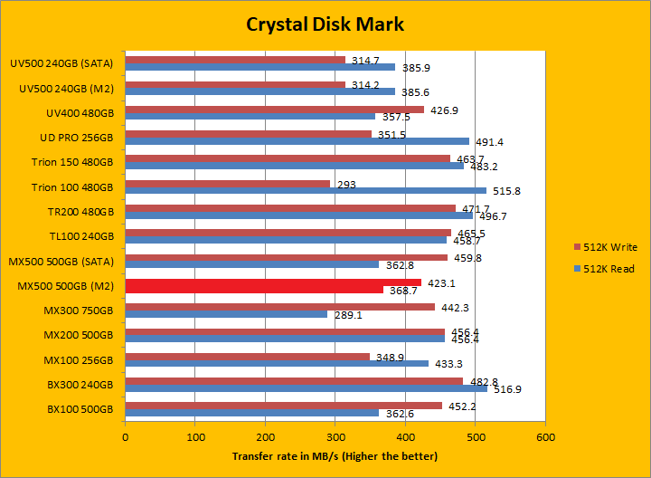 Crystal Disk Mark 3.0 is in the spotlight. Just a bit of background information; higher capacity drives tend to perform a little better in these tests. The ability of a controller and flash memory to deliver high IOPS will provide huge benefits to the score as well. The Crucial MX500 500GB is rated at 95,000 IOPS for read and 90,000 IOPS for write. Its read rating is slightly lower than the MX200, but the write rating is slightly improved. Both figures are an improvement over the MX300 though. Looking at the results, the MX500 M.2 was generally better than the MX300 in both sequential and 512K read and write, but it was not necessarily ahead of the MX200 at all times either. In 4K read and write, the MX500 pulled out way ahead of the MX200, but was only better than the MX300 in the read segment. Lastly, in 4K QD32 read and write, the MX500 M.2 was faster than both the MX200 and MX300 on both counts. In general, it traded punches with the 2.5" SATA MX500 with its performance generally in the same ballpark, as expected. I will let you make your own comparisons in our list of budget SSDs in the graphs above.