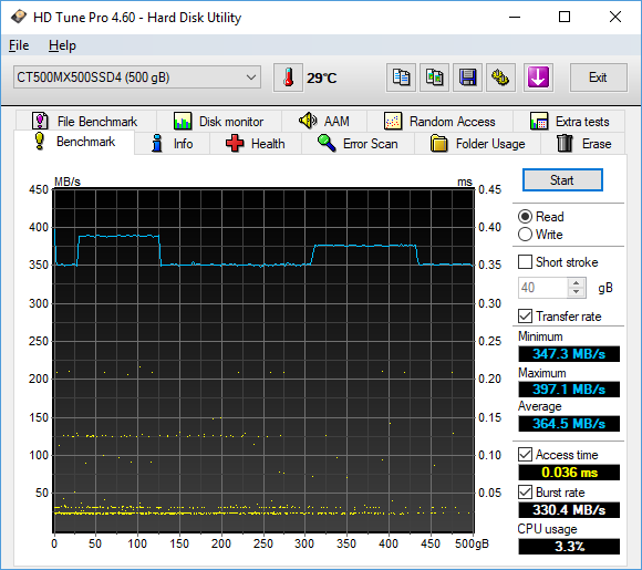 Unfortunately, HD Tune does not generate any fancy independent graph outputs in particular, so I just took a screenshot of the program. Unlike our HD Tach results on the previous page, the line had a couple of bumps in the middle, likely due to the pseudo-SLC algorithm used. Other than that, the results were commendable across the range; the recorded access time was very low, as we would expect from a solid state drive. The Crucial MX500 500GB M.2 posted an average of 364.5MB/s for its sequential read speed, which is, for some reason, was better than the 2.5" SATA MX500's score of 351.7MB/s. Typically, HD Tune results are lower than HD Tach results. Do keep in mind the discussion we had on the previous page, as it still applies here.