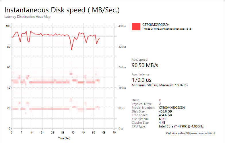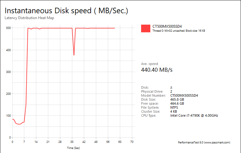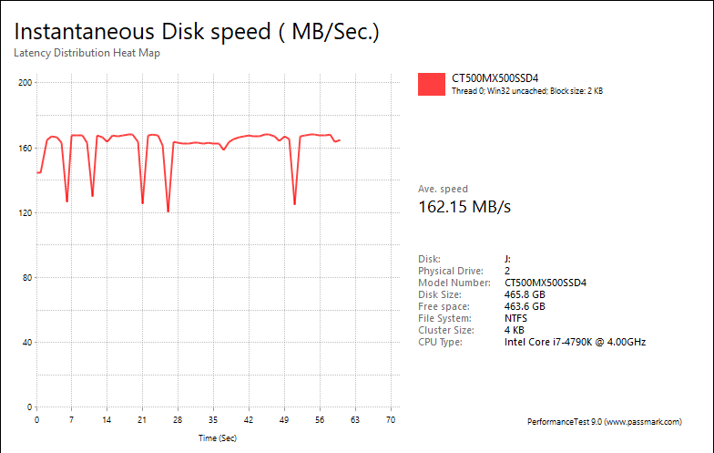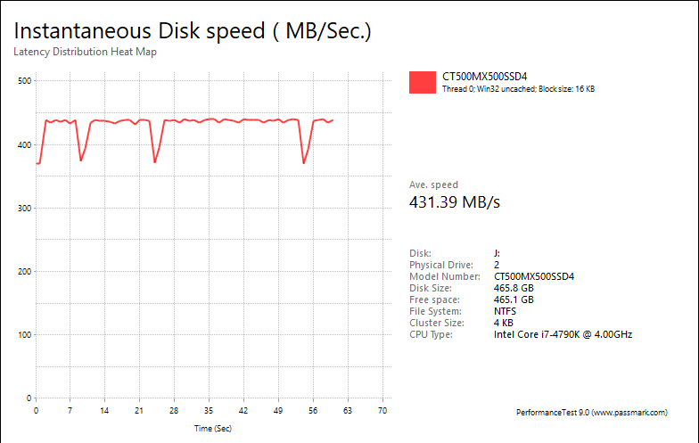 PassMark PerformanceTest 9.0's Advanced Disk Test, unlike HD Tune Pro 4.60, generates some awesome graphs right out of the box. It also provides valuable insight in simulating real world performance applications. To make things clear to you, the first graph simulates a database server, followed by a file server, web server, and workstation. Obviously, PassMark PerformanceTest 9.0 uses highly compressible data in most tests some controllers can really take advantage of. However, it also requires high IOPS capabilities for the best score. In the past, Marvell and Indilinx based drives perform pretty well in this test. One thing clear is the Crucial MX500 500GB provided incredibly flat graphs, which is excellent if you are looking for consistent performance.
