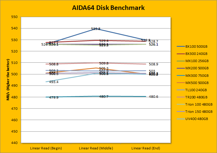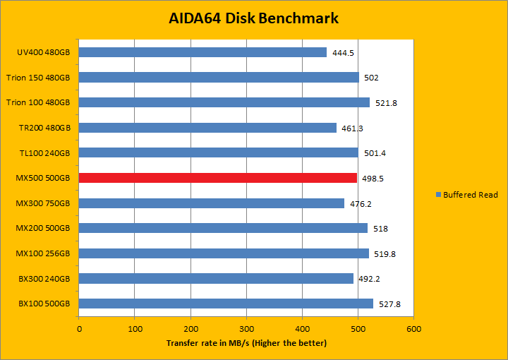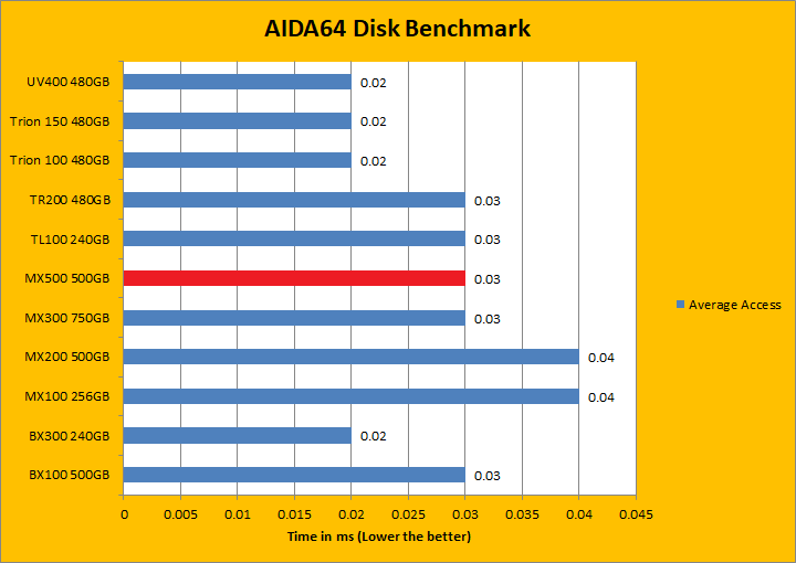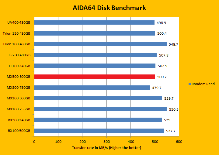 Since our SSD review benchmark results are presented in alphabetical order, first up on the list are results from one of our favorite benchmarking programs, AIDA64 Engineer. Just to note, AIDA64 Engineer is a full synthetic benchmark. Unlike full synthetic motor oil, this usually does not always carry a good connotation. While it is not a representation of real life performance -- such as how fast Photoshop opens -- it does provide valuable insight into performance between different drives and different controllers. As you can see in our graphs above, the Crucial MX500 500GB consistently outperformed the MX300, but still trailed the BX300 and MX200. Compared to these budget oriented drives in the category, the MX500 was within the ballpark. The tested random access time was 0.03ms, which is among the lowest we have ever seen. The rest of the comparison results against all the other drives can be seen in our graphs above.
