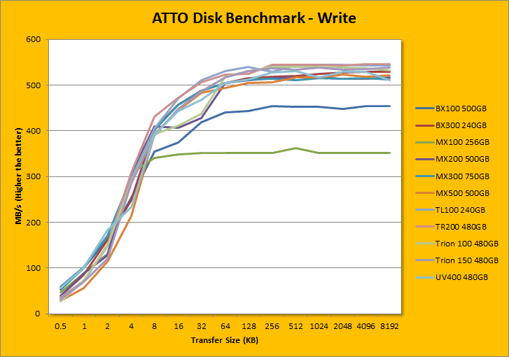 Following up next is our usual ATTO read and write tests. ATTO is an often-quoted benchmark, because it is easy to use and accurate. For the most part, it is a favorite among reviewers, and I have grown to embrace it as much as the next for the last little while. ATTO uses easily compressible data, so compression-heavy controllers will perform very well here; as far as the Silicon Motion SM2258 is concerned -- well, here are our results. As manufacturer peak read and write performance ratings are usually achieved using ATTO, whether a drive lives up to its marketing claims or not can be validated by this program. Crucial claims the MX500 500GB's maximum read and maximum write are pinned at 560MB/s and 510MB/s, respectively. According to our tests, these numbers were slightly underrated. It peaked at 564.467MB/s read and 522.502MB/s write. Under the curve, it was very similar to the BX300 in write, but was slightly outperformed by the MX200 and MX300. In the read category, the MX500 posted considerable improvements over all its predecessors under the curve.