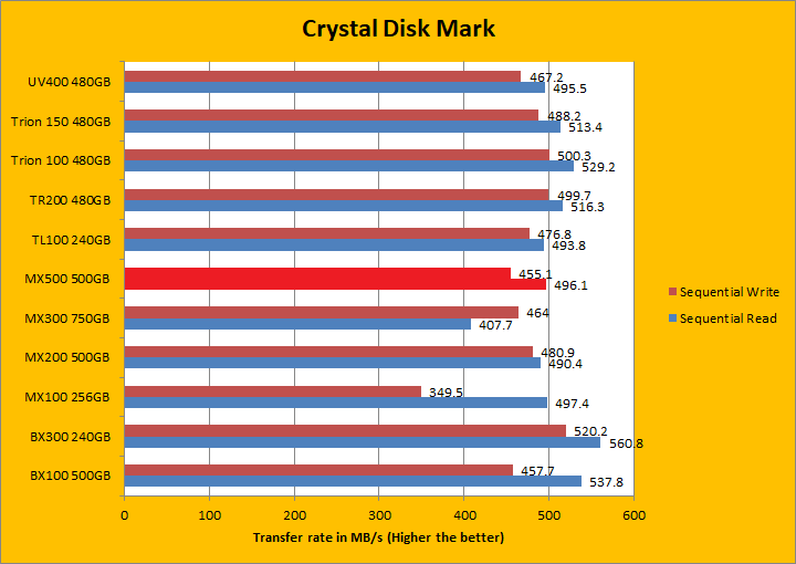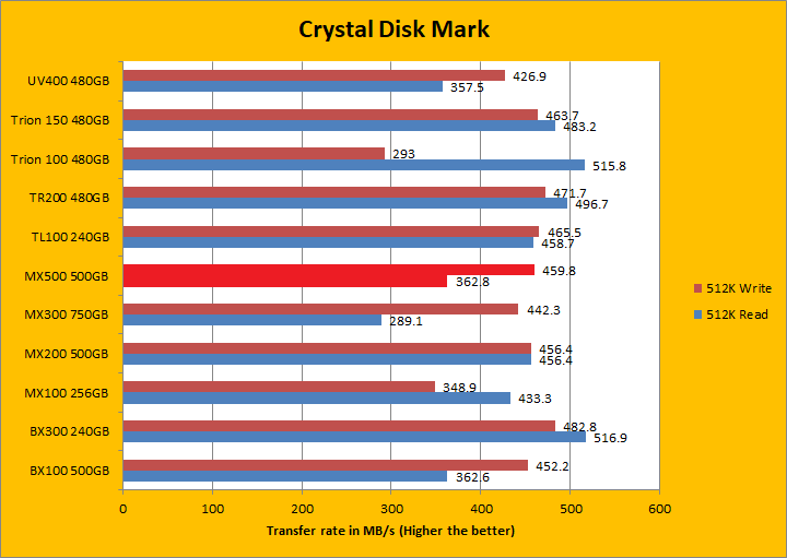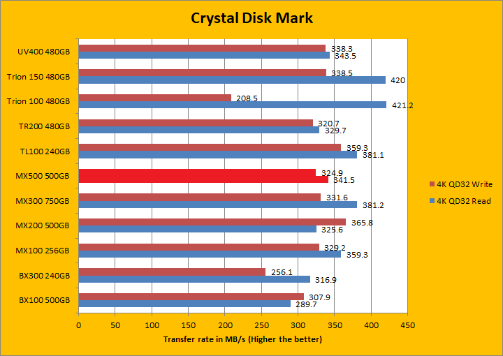 Crystal Disk Mark 3.0 is in the spotlight. Just a bit of background information; higher capacity drives tend to perform a little better in these tests. The ability of a controller and flash memory to deliver high IOPS will provide huge benefits to the score as well. The Crucial MX500 500GB is rated at 95,000 IOPS for read and 90,000 IOPS for write. Its read rating is slightly lower than the MX200, but the write rating is slightly improved. Both figures are an improvement over the MX300 though. Looking at the results, the MX500 was decisively better than the MX300 in both sequential and 512K read and write, but it was, on average, slower than the MX200 in the same areas. In 4K read and write, the MX500 pulled out way ahead of the MX200, but was only better than the MX300 in the read segment. Lastly, in 4K QD32 read and write, the MX500 was marginally slower than the MX300 on both counts, but once again, traded punches with the MX200. I will let you make your own comparisons in our list of budget SSDs in the graphs above.