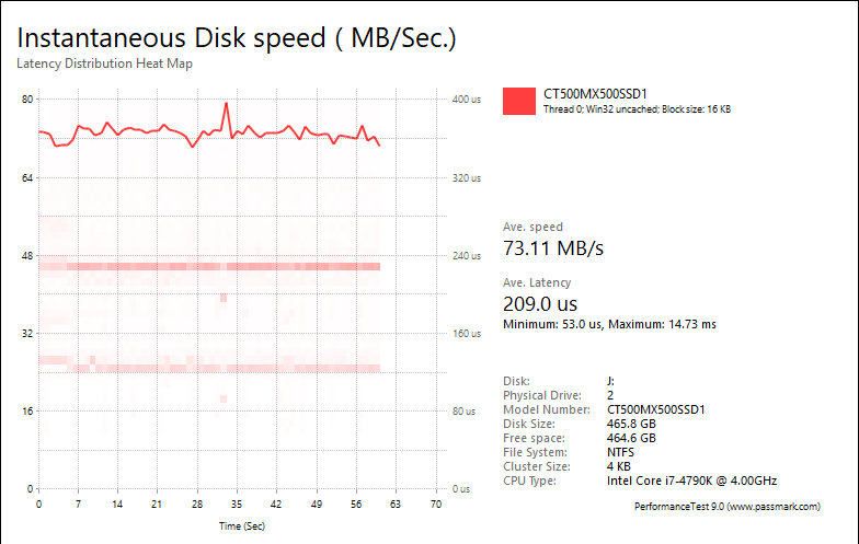 PassMark PerformanceTest 9.0's Advanced Disk Test, unlike HD Tune Pro 4.60, generates some awesome graphs right out of the box. It also provides valuable insight in simulating real world performance applications. To make things clear to you, the first graph simulates a database server, followed by a file server, web server, and workstation. Obviously, PassMark PerformanceTest 9.0 uses highly compressible data in most tests some controllers can really take advantage of. However, it also requires high IOPS capabilities for the best score. In the past, Marvell and Indilinx based drives perform pretty well in this test. One thing clear is the Crucial MX500 500GB provided incredibly flat graphs, which is excellent if you are looking for consistent performance.