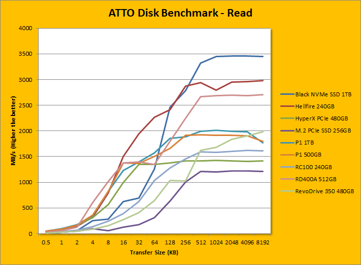 Following up next is our usual ATTO read and write tests. ATTO is an often-quoted benchmark, because it is easy to use and accurate. For the most part, it is a favorite among reviewers. ATTO uses easily compressible data, so compression-heavy controllers will perform very well here. As manufacturer peak read and write performance ratings are usually achieved using ATTO, whether a drive lives up to its marketing claims or not can be validated by this program. Crucial claims maximum read and write numbers of 2000MB/s and 1700MB/s, respectively. According to our tests, these numbers were pretty close to what we saw, as our numbers peaked at 2008.245MB/s read and 1669.374MB/s write. In terms of ramp-up, the Crucial P1 1TB was also pretty fast at reaching peak speeds for write and even more so for the read test. At smaller packet sizes, the P1 1TB compared favorably with most of the drives. Compared with the recent WD Black NVMe SSD, the P1 obviously peaks at a lower overall number, but ramp-up is pretty similar for write and better for read.