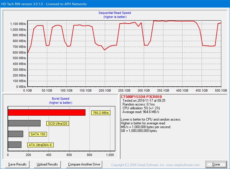 After giving the Crucial P1 500GB a clean format and ensuring alignment and everything is correct, I fired it up for some testing in HD Tach. HD Tach is more of a drag race than a clear indication of real life performance and has been around for a really long time. It is an excellent storage performance reference among SSDs with the same controller, and has been our favorite benchmark long before hard drives even cracked the 50MB/s mark. With an average read speed of 964.6MB/s according to HD Tach in single disk configuration, this score is pretty good in this class. It still is slower than the larger 1TB variant by around 100MB/s. The Crucial P1 500GB burst speed rating was also good at 760.2MB/s. At the end of the day, HD Tach may not be the best test for solid state drives all the time, but these results are always interesting to look at.