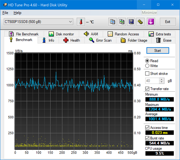 Unfortunately, HD Tune does not generate any fancy independent graph outputs in particular, so I just used a screenshot. Like our HD Tach results on the previous page, the line was a bit bumpy, but remained fairly flat on average. It differs slightly in magnitude than the other program -- probably due to testing algorithms used -- but its performance characteristics are identical in practice. Other than that, the results were commendable across the range; the recorded access time was very low, as we would expect from a solid state drive. The Crucial P1 500GB posted an average of 1001.4MB/s for its sequential read speed. Do keep in mind the discussion we had on the previous page, as it still applies here.