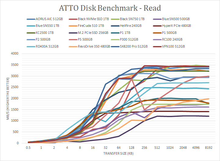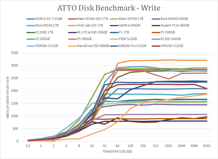 Next on our list is our usual ATTO read and write tests. ATTO is an often-quoted benchmark, because it is easy to use and accurate. For the most part, it is a favorite among reviewers. ATTO uses easily compressible data, so compression-heavy controllers will perform very well here. As manufacturer peak read and write performance ratings are usually achieved using ATTO, whether a drive lives up to its marketing claims or not can be validated by this program. As we read on the first page, Crucial claims maximum read and write numbers of 2300MB/s and 940MB/s, respectively. According to our tests, the read speeds peaked at 3113.623MB/s, while the write speeds reached 2966.413MB/s. These are excellent numbers, even if you disregard the fact this is a budget drive. These results were also massive increases over the quoted numbers from the manufacturer, which is a bit strange if I am being honest. While we often see slight increases from the rated speeds, this is the first drive I have seen that provided numbers with this sort of disparity. In terms of ramp-up, the P2 500GB compared similarly to the P300 512GB, but outperformed the other budget WD Blue NVMe solutions. In the write ramp-up, the Crucial P2 500GB slotted below the Patriot P300 512GB and above the WD Blue SN550 1TB. Overall, these are still very impressive results for both the peak and the ramp-up speeds.