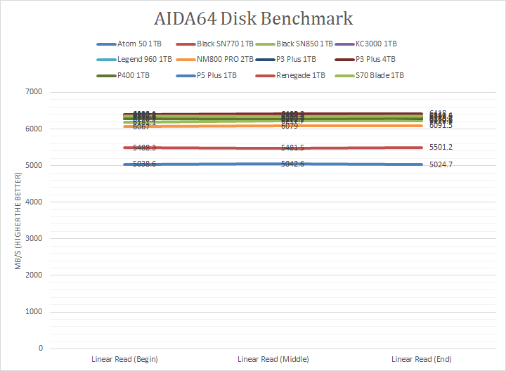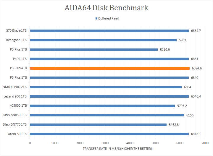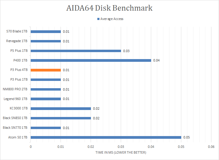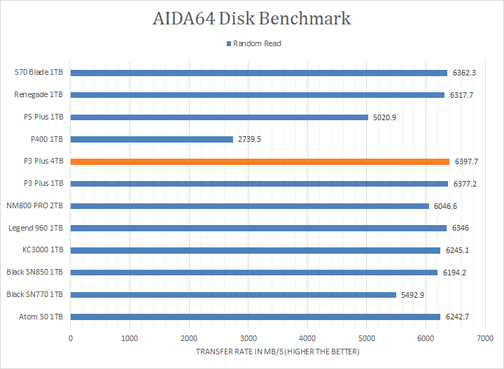 Since our SSD review benchmark results are presented in alphabetical order, first up on the list are results from one of our favorite benchmarking programs, AIDA64 Engineer. Version 6.88.6400, the latest release at press time, can be downloaded from our Downloads page. Just to note, AIDA64 Engineer is a full synthetic benchmark. Unlike full synthetic motor oil, this usually does not always carry a good connotation. While it is not a representation of real-life performance -- such as how fast Photoshop opens -- it does provide valuable insight into performance between different drives and different controllers. As you can see in our graphs above, the Crucial P3 Plus 4TB, like the 1TB variant, came in at the top or near the top in all the read tests, which is surprisingly good. The P3 Plus 4TB scored consistently around the 6407MB/s mark in the linear read segment, and the tested latency was very low with an average of 0.01ms. The P3 Plus 4TB was also nearly identical -- within 0.7% on average -- compared to the P3 Plus 1TB. The comparison results against all the other drives can be seen in our graphs above.