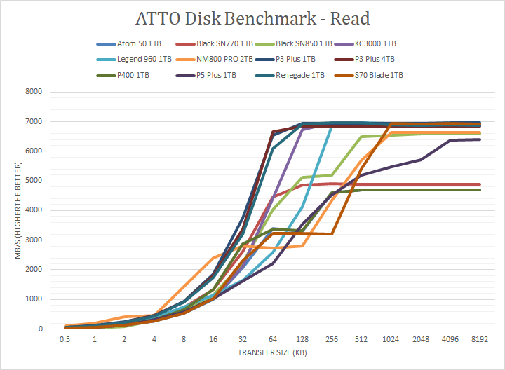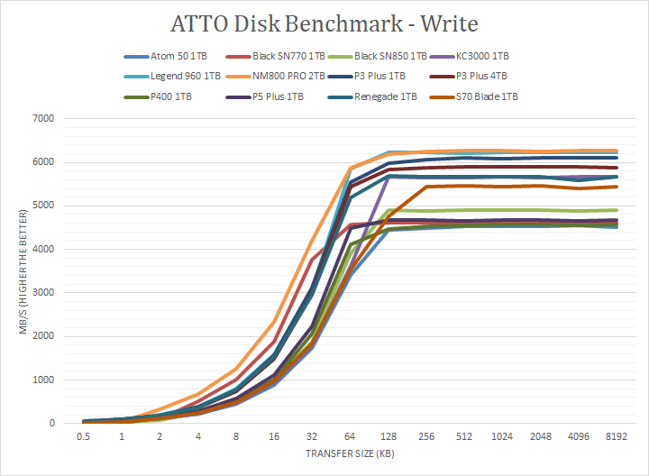 Under the write curve, the Crucial P3 Plus 4TB continued to deliver solid ramp-up speed, delivering very similar performance to the P3 Plus 1TB and much more expensive ADATA Legend 960 1TB. It even leapt ahead of the Kingston FURY Renegade 1TB at 64K and above. The WD_BLACK SN770 NVMe SSD 1TB was faster between 4K and 32K though. Compared to the P5 Plus 1TB, well, there was simply no comparison -- the P3 Plus 4TB had higher numbers at every transfer size in both read and write. Overall, the Crucial P3 Plus 4TB's performance is excellent in this test, thanks to the fast PCIe 4.0 interface and highly optimized firmware.