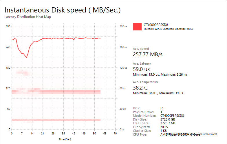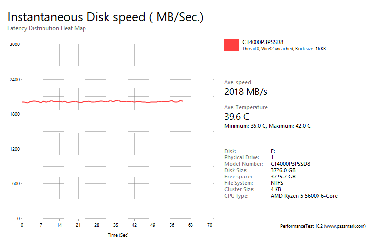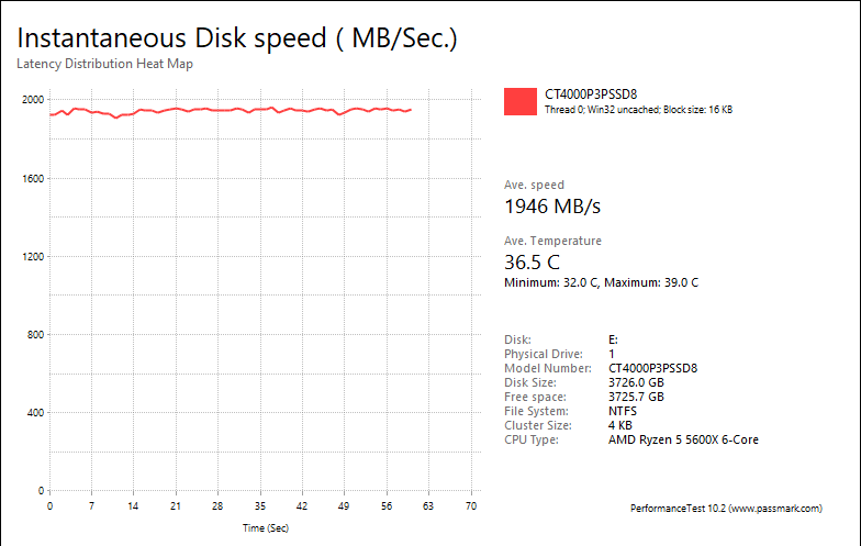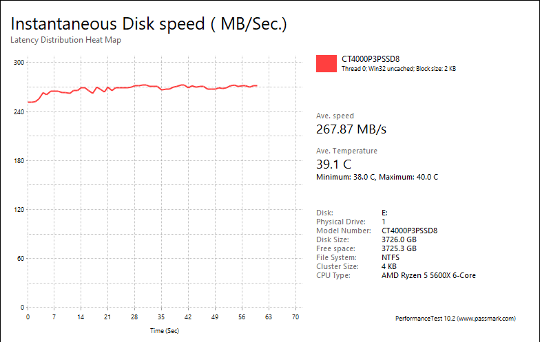 PassMark PerformanceTest 10's Advanced Disk Test, unlike HD Tune Pro 5.70, generates some awesome graphs right out of the box. It also provides valuable insight in simulating real world performance applications. To make things clear to you, the first graph simulates a database server, followed by a file server, web server, and workstation. Obviously, PassMark PerformanceTest 10 uses highly compressible data in most tests some controllers can really take advantage of. However, it also requires high IOPS capabilities for the best score. One thing clear is the Crucial P3 Plus 4TB provided generally flat graphs, which is excellent if you are looking for consistent performance.