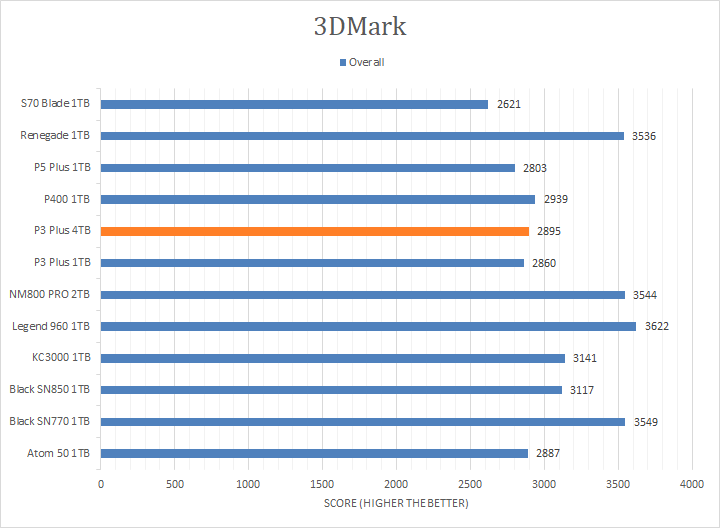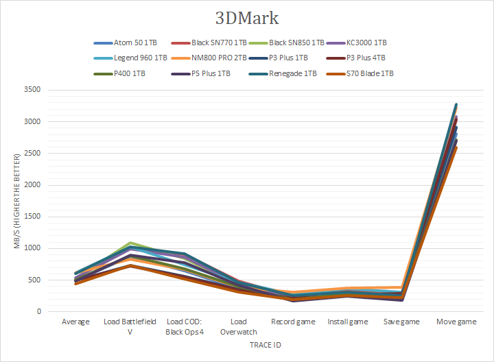 3DMark is the continuously updated version of the popular gaming benchmark from UL. We used 3DMark's Storage Benchmark to test the performance of the Crucial P3 Plus 4TB. According to UL, the Storage Benchmark uses traces recorded from popular games and gaming-related activities to measure real-world gaming performance. The following traces were used and defined as follows: