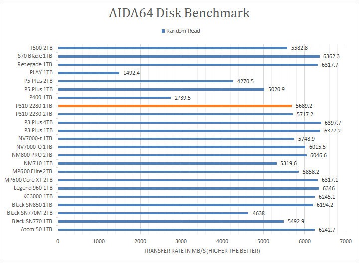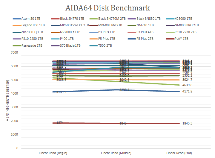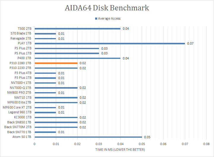 As you can see in our graphs above, the Crucial P310 2280 1TB came in just at average compared to our large collection of compared SSDs. It scored consistently around the 5800MB/s mark in the linear read segment, making it virtually the same as the P310 2280 1TB. This also means it was about the same as the same as the Corsair MP600 Elite 2TB, a little bit slower than the Netac NV7000-Q 1TB, but way faster than the WD_BLACK SN770 1TB. The tested latency was very low with an average of 0.02ms. The comparison results against all the other drives can be seen in our graphs above.