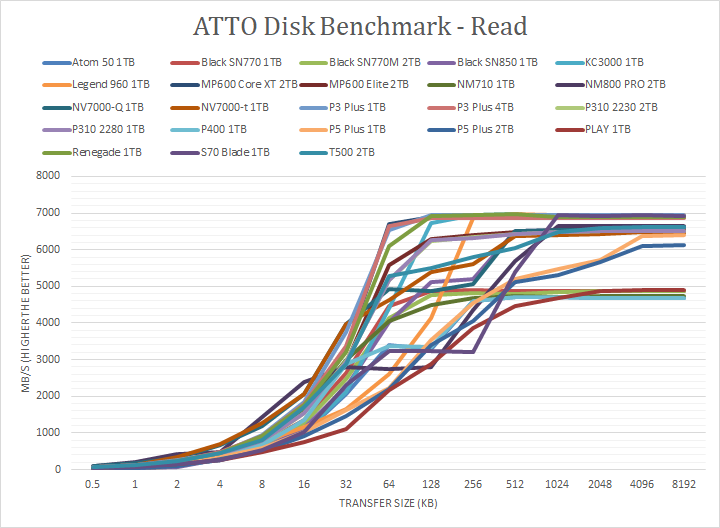 Under the write curve, the Crucial P310 2280 1TB was almost identical to the Corsair MP600 Elite 2TB up to 32K. The P310 2280 was significantly faster than the WD_BLACK SN770 1TB pretty much the entire test, but did not pull ahead of the Netac NV7000-Q 1TB until 128K. Once again, there was no discernible difference between the P310 2280 1TB and P310 2230 2TB in ATTO. Overall, the Crucial P310 2280 1TB's performance was pretty good for a mainstream drive, thanks to the fast PCIe 4.0 interface.