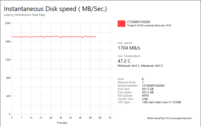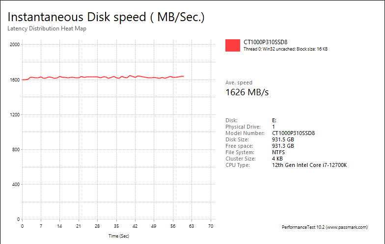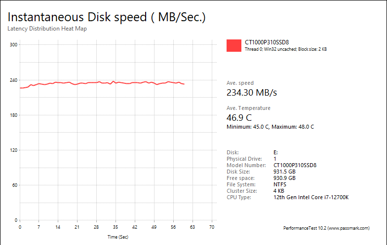 PassMark PerformanceTest 10's Advanced Disk Test, unlike HD Tune Pro 5.70, generates some awesome graphs right out of the box. It also provides valuable insight in simulating real world performance applications. To make things clear to you, the first graph simulates a database server, followed by a file server, web server, and workstation. Obviously, PassMark PerformanceTest 10 uses highly compressible data in most tests some controllers can really take advantage of. However, it also requires high IOPS capabilities for the best score. One thing clear is the Crucial P310 2280 1TB provided generally flat graphs, which is excellent if you are looking for consistent performance.