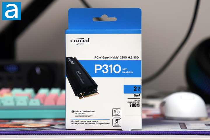 Unsurprisingly, the retail container of the heatsink added Crucial P310 2280 2TB looks like other Crucial P310 SSDs we have reviewed in the past. As my colleague Jonathan Kwan describes it, Crucial's retail package designs have always been about business, and I can agree with this sentiment. There are no flashy advertisements or unnecessary graphics, although there are still some featured selling points on the front. The color scheme is plain blue and white. The eye-catching aspect is the product name, followed by the scaled down image beside it. Up top, we have the Crucial by Micron logo. On the right side, they have labeled the capacity and specified read speed of up to 7100MB/s. Underneath, there is a small descriptor of "High performance game storage", with logos indicating its PS5 compatibility and five-year warranty. In addition, there is an Adobe logo to show Crucial has included a one-month subscription of Adobe's Creative Cloud suite of applications. Around the back, there are a few more selling points in multiple languages.