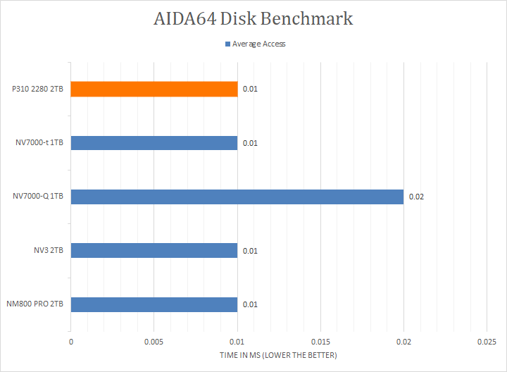 From the graphs above, the Crucial P310 2280 2TB performed about as expected. Across the tests, it was neither the fastest nor slowest of the PCIe 4.0 drives. In the linear test, it ranked right in the middle of the drives. This average performance continued for the random read and buffered read tests. Compared to Kingston NV3 2TB, the P310 2280 2TB was close in every test while notably beating it in buffered read. Finally, its access time was 0.01ms.
