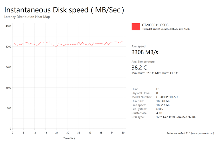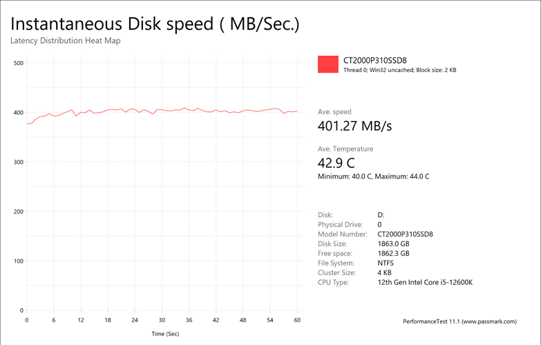The Crucial P310 2280 2TB provided us with average results of 401.27MB/s, 3211MB/s, 3308MB/s, and 316.19MB/s. These were favorable numbers across the board. For some perspective, other QLC drives like the Netac NV7000-Q 1TB provided us with results of 123.05MB/s, 972.74MB/s, 3338MB/s, and 242.05MB/s, while the Kingston NV3 2TB gave us results of 241.37MB/s, 3258MB/s, 1192MB/s, and 240.45MB/s. The fastest results I have seen overall came from the Lexar Professional NM800 PRO 2TB, with speeds of 444.92MB/s, 3259MB/s, 3453MB/s, and 282.82MB/s, respectively.