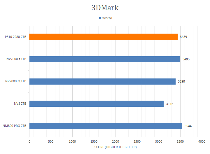 As for 3DMark, the Crucial P310 2280 2TB provided more average numbers, coming in third out of five drives. It showed to be a capable drive across the tests, with no glaringly bad test result. As such, I was pleased with this result for a QLC-based DRAM-less budget drive.