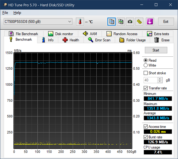 Unfortunately, HD Tune does not generate any fancy independent graph outputs in particular, so I just used a screenshot. Unlike our HD Tach results on the previous page, the line was mostly flat. It differs slightly in magnitude than the other program -- probably due to testing algorithms used -- but its performance characteristics are identical in practice. Other than that, the results were similar across the range; the recorded access time was very low, as we would expect from a solid state drive. The Crucial P5 500GB posted an average of 1343.8MB/s for its sequential read speed. Do keep in mind the discussion we had on the previous page, as it still applies here.