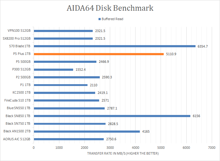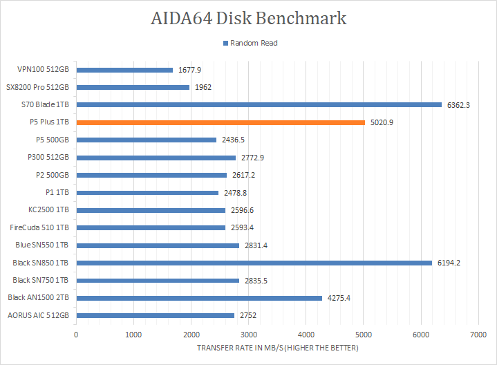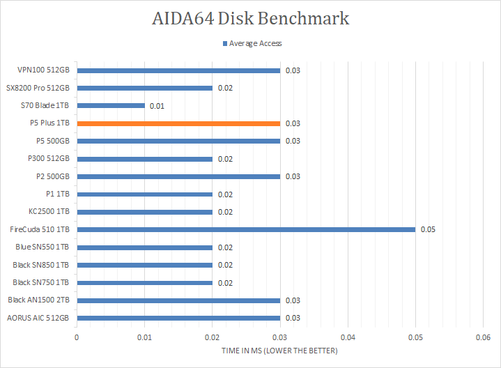 Since our SSD review benchmark results are presented in alphabetical order, first up on the list are results from one of our favorite benchmarking programs, AIDA64 Engineer. Version 6.33.5700, the latest release at press time, can be downloaded from our Downloads page. Just to note, AIDA64 Engineer is a full synthetic benchmark. Unlike full synthetic motor oil, this usually does not always carry a good connotation. While it is not a representation of real-life performance -- such as how fast Photoshop opens -- it does provide valuable insight into performance between different drives and different controllers. As you can see in our graphs above, the Crucial P5 Plus 1TB came in third in every test, behind the PCIe 4.0-based WD_BLACK SN850 1TB and XPG Gammix S70 Blade 1TB. It scored consistently around the 5035MB/s mark in the linear read segment. The tested latency was very low with an average of 0.03ms. The rest of the comparison results against all the other drives can be seen in our graphs above.