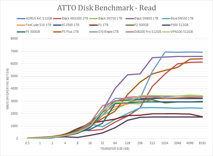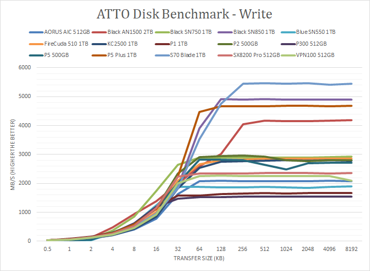 Following up next are our usual ATTO read and write tests. ATTO is an often-quoted benchmark because it is easy to use and accurate. For the most part, it is a favorite among reviewers and I have grown to embrace it as much as the next for the last little while. ATTO uses easily compressible data, so compression-heavy controllers will perform very well here. As far as the Crucial controller on the P5 Plus is concerned, well, here are our results. It peaked at 6390MB/s read and 4680MB/s write. Under the curve, it was interesting because the P5 Plus was faster than the SN850 and S70 Blade at up to 16K and 64K, respectively, for write. In the read test, the P5 Plus was faster than the SN850 up to 16K and was about the same as the S70 Blade up to 16K. Above the mentioned transfer sizes, both the SN850 and S70 Blade significantly outperformed the P5 Plus, which was expected given the Crucial is a budget drive. Overall, the Crucial P5 Plus 1TB's performance was very good for the price bracket it is in, thanks to the higher peak speeds afforded by the PCIe 4.0 interface.