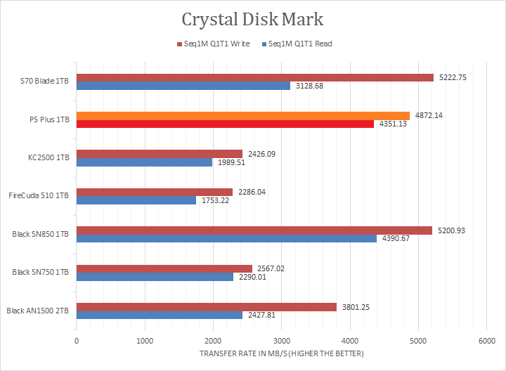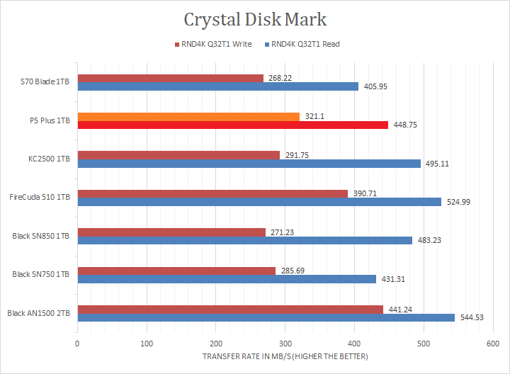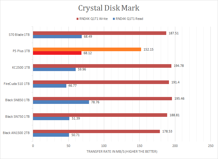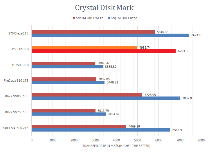 Crystal Disk Mark 8.0 is in the spotlight. Just a bit of background information, higher capacity drives tend to perform a little better in these tests. The ability of a controller and flash memory to deliver high IOPS will provide huge benefits to the score as well. The Crucial P5 Plus 1TB is rated at up to 630,000 IOPS read and 700,000 IOPS write, which is good. As manufacturer peak read and write performance ratings are usually achievable using Crystal Disk Mark, whether a drive lives up to its marketing claims or not can be validated by this program. Crucial claims the P5 Plus 1TB's maximum read and maximum write are pinned at 6600MB/s and 5000MB/s, respectively. Looking at the read and write results of all four sections, the P5 Plus 1TB was a bit behind in the linear read and write section against other PCIe 4.0 NVMe drives, but the numbers were expected given this is a budget drive. It performed admirably, even coming in first place, in the Seq1M Q1T1 read test, but the write results were behind both the XPG Gammix S70 Blade and WD_BLACK SN850. A similar story can be told in the RND4K Q32T1 tests, even getting beat by PCIe 3.0-based drives in read, but nonetheless remained mostly consistent with the rest of the group. Lastly, in the RND4K Q1T1 segment, the P5 Plus was behind everyone in the write test, but its read results were very good. I will let you make your own comparisons in our list of SSDs in the graphs above.