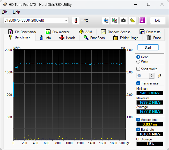 Unfortunately, HD Tune does not generate any fancy independent graph outputs in particular, so I just took a screenshot of the program. The Crucial P5 Plus 2TB's throughput remained very flat on average. While HD Tune is more of a drag race than a clear indication of real-life performance, it is an excellent storage performance reference among SSDs with the same controller. The results were good across the range and the recorded access time was low, as we would expect from a solid state drive.