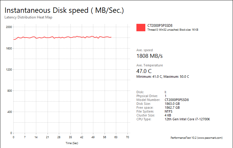 PassMark PerformanceTest 10's Advanced Disk Test, unlike HD Tune Pro 5.70, generates some awesome graphs right out of the box. It also provides valuable insight in simulating real world performance applications. To make things clear to you, the first graph simulates a database server, followed by a file server, web server, and workstation. Obviously, PassMark PerformanceTest 10 uses highly compressible data in most tests some controllers can really take advantage of. However, it also requires high IOPS capabilities for the best score. One thing clear is the Crucial P5 Plus 2TB provided generally flat graphs, which is excellent if you are looking for consistent performance.