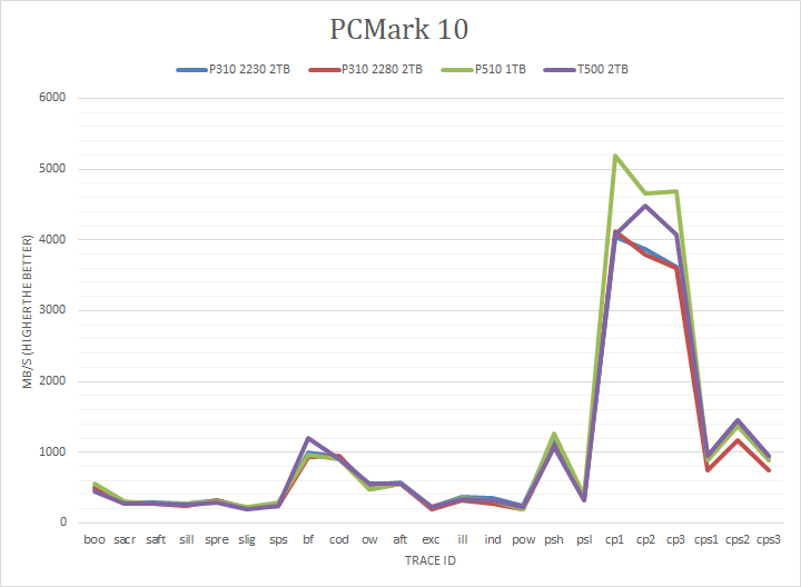 As can be seen in our graphs above, the Crucial P510 1TB came in marginally better than the group of competitors. The final score tells a lot of the story, but the details are important as we look at the throughput of each of the twenty-three traces used. In these simulated real-life workloads, the Crucial P510 1TB continuously traded blows with the compared SSDs, which was reflected by its final score.