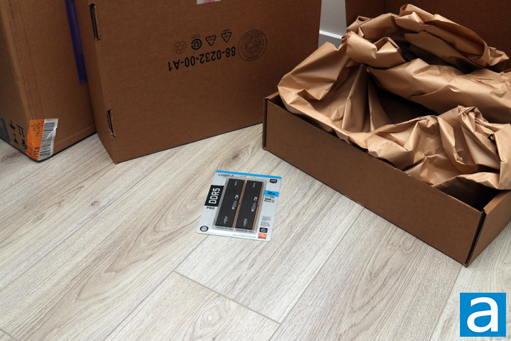Continuing our journey inside, two more boxes can be found inside this large cardboard box, and one is marked with an "Empty Box" sticker. The other is where our memory kit can be found, surrounded by a lot of packing paper. Finally, buried underneath all of this is our kit of Crucial Pro DDR5-5600 2x16GB. It is a bit amusing to see all this packaging material for one of the smallest and flattest review samples we have received. Otherwise, the retail container is straightforward. While the Crucial CT2K16G56C46U5 was just a plastic shell, this Pro variant comes upgraded with cardboard framing around the shell for a bit more substance.
