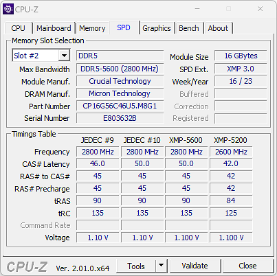 A screenshot of the memory tab in CPU-Z with the Crucial Pro DDR5-5600 2x16GB kit installed. These modules show up in CPU-Z with the same part number as the Crucial CT2K16G56C46U5 2x16GB DDR5-5600 kit. The SPD timings table in CPU-Z reads standard JEDEC specifications programmed into the memory as well as XMP data for running the memory at various speeds. Our ASUS ProArt Z690-Creator WiFi motherboard used for testing had no issues detecting the Crucial RAM right out of the box using the latest BIOS revision. At the time of the review, the Crucial Pro DDR5-5600 2x16GB kit has an MSRP of $115, but it can be found on sale for less.