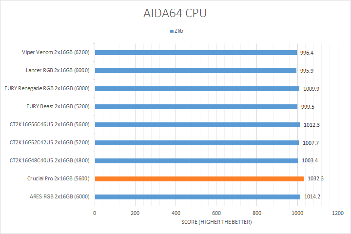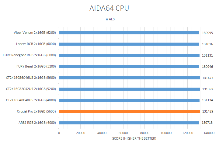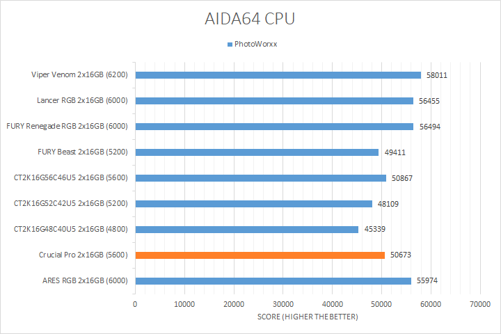 Looking at the first set of AIDA64 tests, the CPU benchmarks, you can see most of our DDR5 memory kits performed close to each other. The only test with notable differences was PhotoWorxx, as the results scaled with the operating transfer speeds of the memory. The Crucial Pro DDR5-5600 2x16GB result here was like the other Crucial memory kits, specifically the 5600MT/s kit. The Crucial Pro was slightly behind the OEM-grade Crucial kit in most of the benchmarks, although I would not say there is a large enough delta to be concerned. Otherwise, the rest of the tests showed all these kits were evenly matched with slight differences across the other four tests.