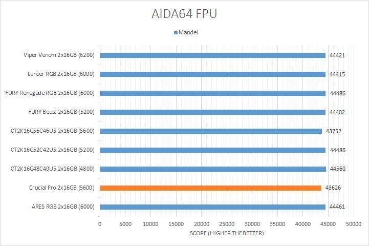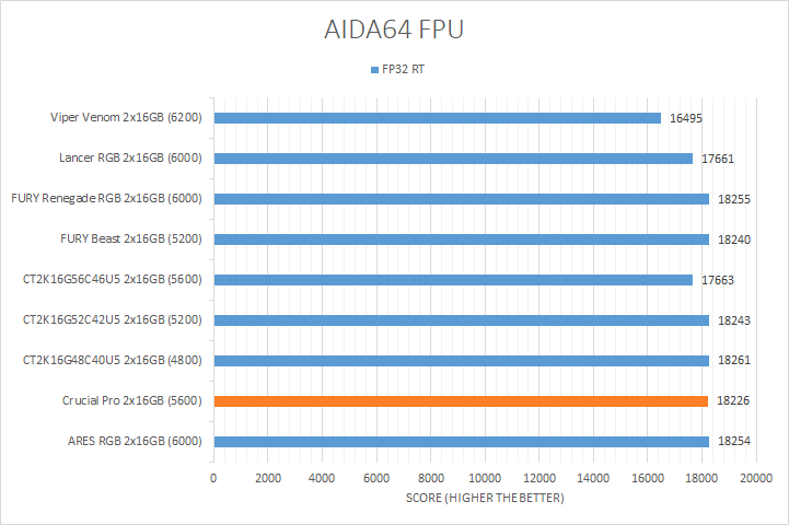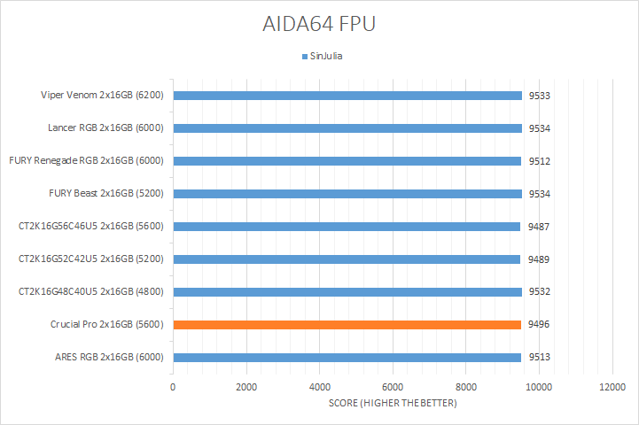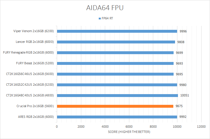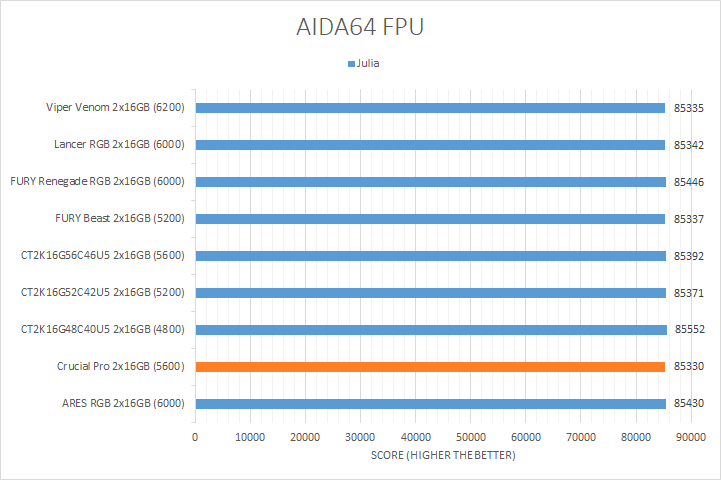 Our second set of AIDA64 tests, the FPU benchmarks, are often the most uneventful results, because they rarely provide much difference between memory kits and instead the results are more dependent on the processor. This is mostly true, as the first three tests showed results with little variance between the tested memory. However, it changed with the floating point 32 and 64 ray tracing tests, as we had more differences in the results. The Crucial Pro DDR5-5600 2x16GB was near the back half of our results, especially when compared to the other kits running at the same transfer speeds and the non-Pro Crucial memory. For the floating point 32 and 64 ray tracing tests, the Crucial Pro was in the lower half of all the results. Overall, the numbers here ere within the ballpark range of what you might expect from DDR5 memory.