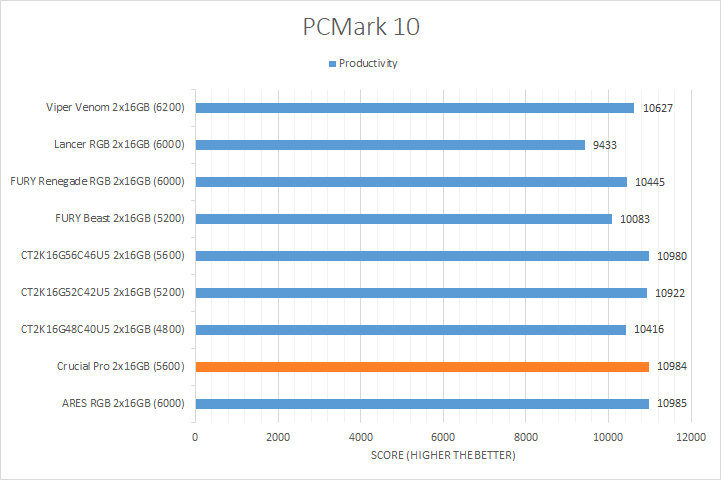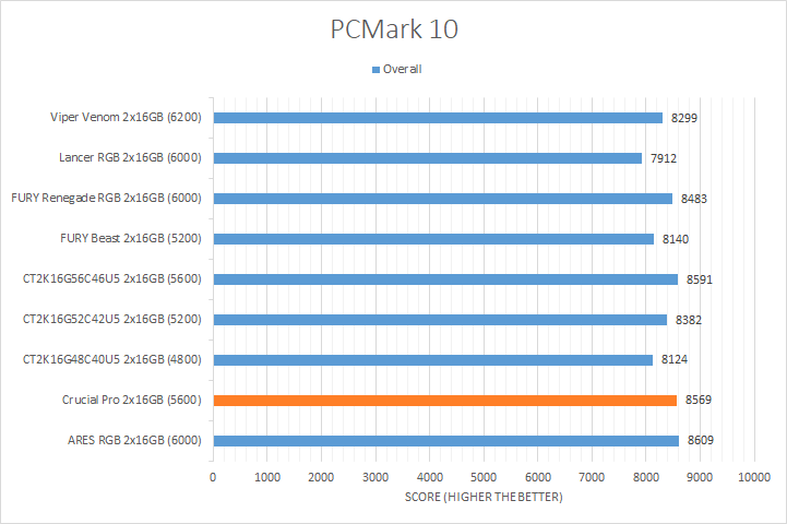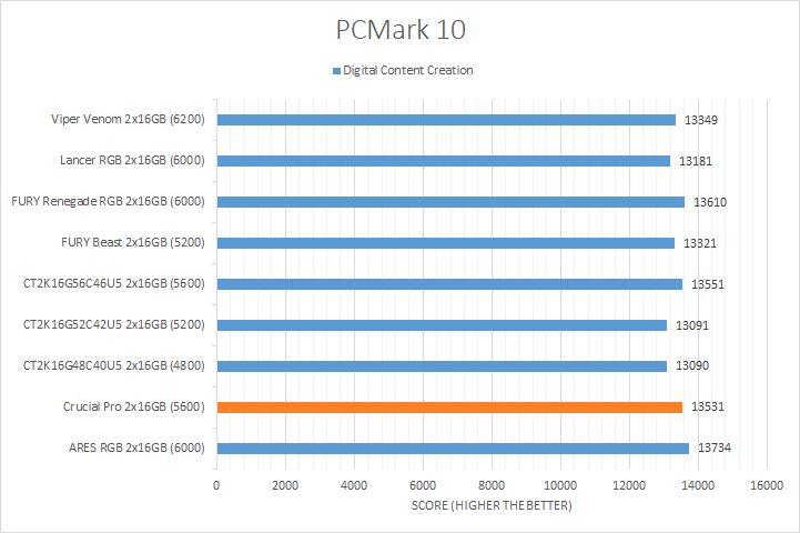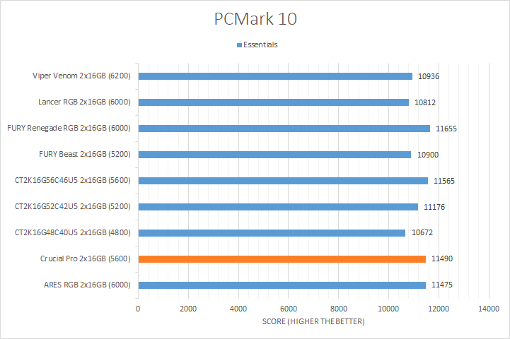 PCMark 10 is the popular full system benchmark from UL. A standard benchmark run provides scores in three categories, which includes Essentials, Productivity, and Digital Content Creation. Wrapping up all three categories is an overall score in the end. This is a synthetic test that aims to emulate real-world conditions, which provides interesting insight into the performance of your system. From our results above, the Crucial Pro DDR5-5600 performed quite well in this benchmark, finishing with the third highest score, which was impressive. It was slightly behind the OEM-grade memory from Crucial, although this difference was not huge. If you break down the results into the categories, you can see it was fourth in Essentials, second in Productivity, and fourth in Digital Content Creation.
