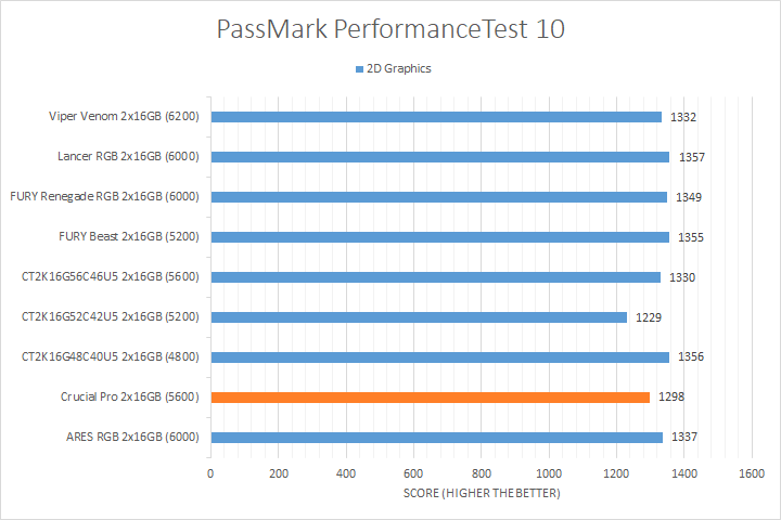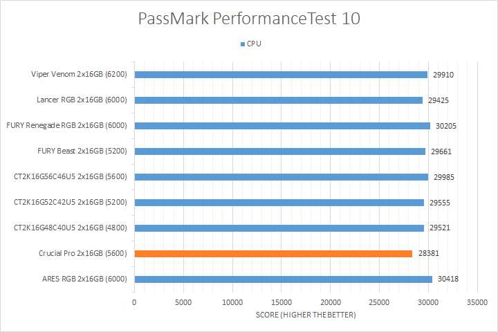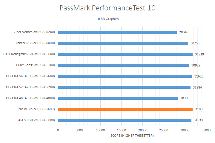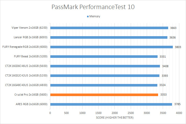 PassMark PerformanceTest 10 is used to evaluate four different areas of our system: CPU, RAM, 2D Graphics, and 3D Graphics. It takes a different approach in obtaining results compared to other programs, which is why we like to use it, haha. PassMark Performance Test 10's memory benchmarking tool is the only test in our setup that takes memory capacity into account, but it does not seem to account for anything above 16GB from our past experience. Also, all our kits assessed are 32GB in total capacity, which makes this point moot. The memory benchmarks did account for the differences in data transfer rates. The result from the Crucial Pro was even slower than expected, as it fell in between our two DDR5-5200 memory kits. It was also the worst CPU result we have seen. Otherwise, our Crucial Pro kit today was behind the rest in the 2D Graphics test, while also performing the best in our 3D graphics tests. In fact, the 3D Graphics test showed results all over the place and seemed to have little relationship with anything.