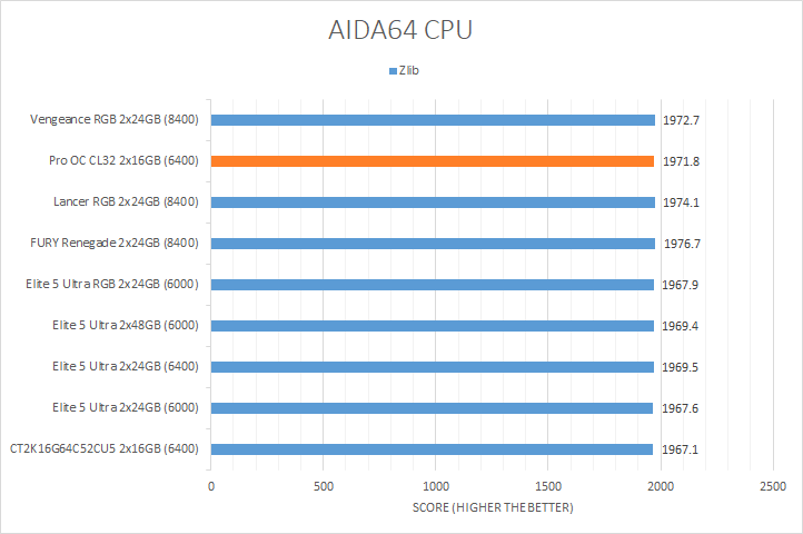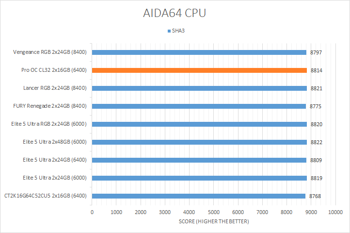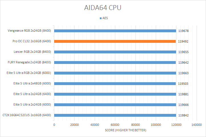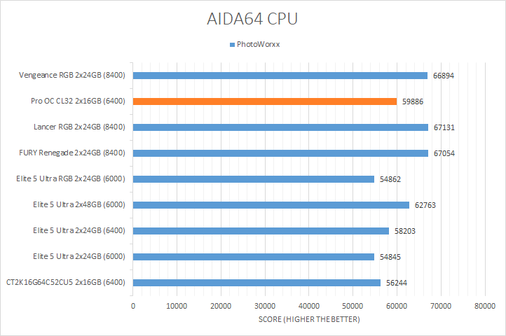 It was quite interesting how the products compared, because there is 2.4GHz between the fastest and slowest kit. As far as how their performance went, all of them were close to each other in most tests, with the Crucial Pro Overclocking CL32 DDR5-6400 2x16GB sitting at where we expected it to be in relative to the compared kits. AIDA64 did not gain much from stepping up your memory speed with the exception of the PhotoWorxx results, where the DDR5-8400 kits occupied the upper end of the chart, while the DDR5-6400 Pro Overclocking CL32 came in mid-pack.