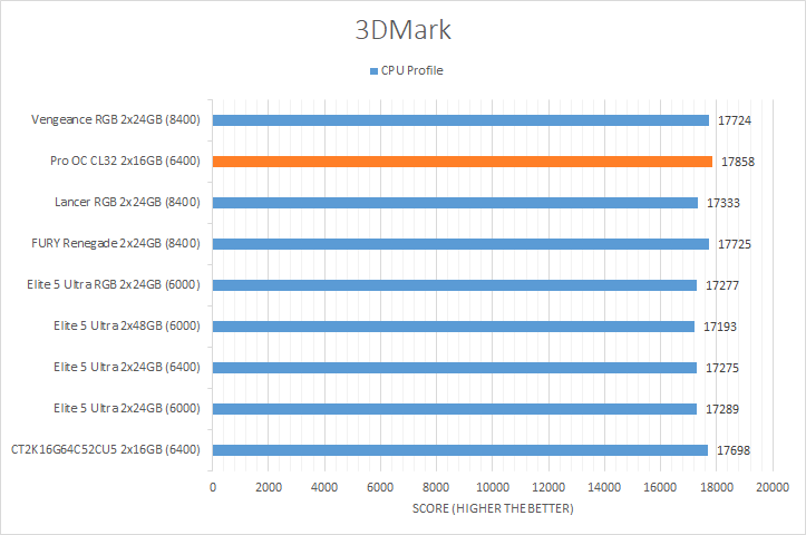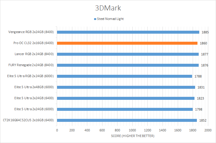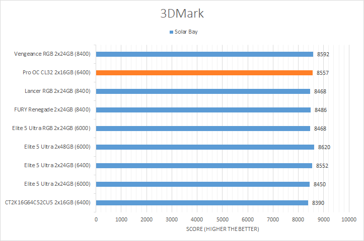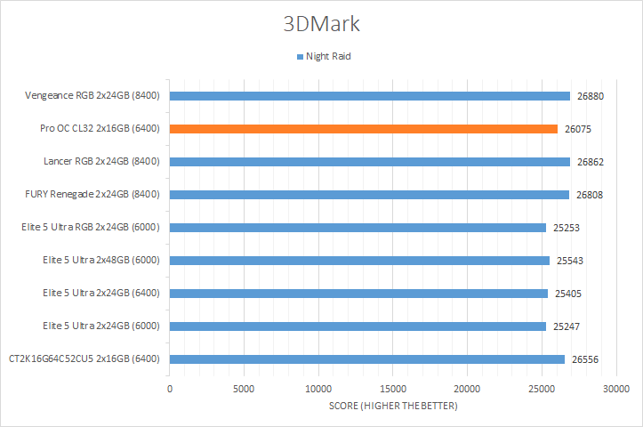 As you can see in our graphs above, all of the tested RAM, including the Crucial Pro Overclocking CL32 DDR5-6400 2x16GB we are reviewing today, showed a good degree of score variance, with some tests more than others. This demonstrates memory bandwidth played some role in most of these tests, with some more than others like Night Raid, where the DDR5-8400 kits clearly performed better that the rest.