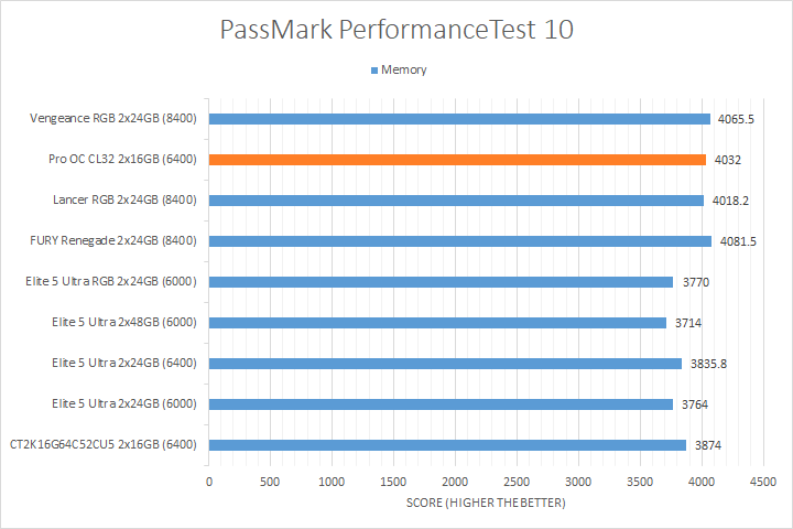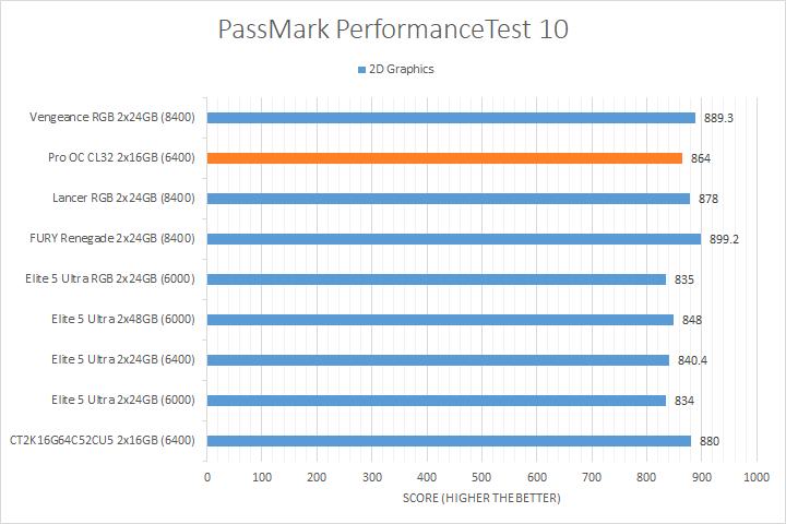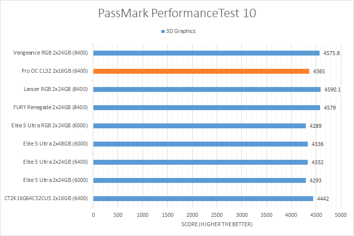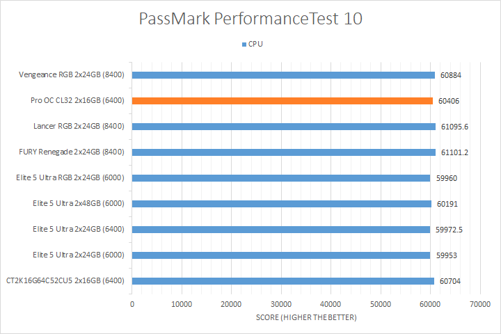 We run PassMark PerformanceTest 11 to evaluate four different areas of our system; coming down to the CPU, 2D Graphics, 3D Graphics, and RAM. It takes a somewhat different approach in obtaining results compared to other programs, which is why we like to use it. PassMark Performance Test 11's memory benchmarking tool is the only test in our setup that takes memory capacity into account, but it does not seem to account for anything above 16GB from our past experience. The memory benchmarking tool did account for the extra bandwidth, so faster RAM generally performed better, although the Crucial Pro Overclocking CL32 DDR5-6400 2x16GB had no issues keeping up with the DDR5-8400 kits. We also observed a measurable performance difference between the DDR5-8400 kits and most DDR5-6000/DDR5-6400 kits for the 2D Graphics and 3D Graphics Tests. Other than that, the CPU test was generally reasonably close between all tested memory.
