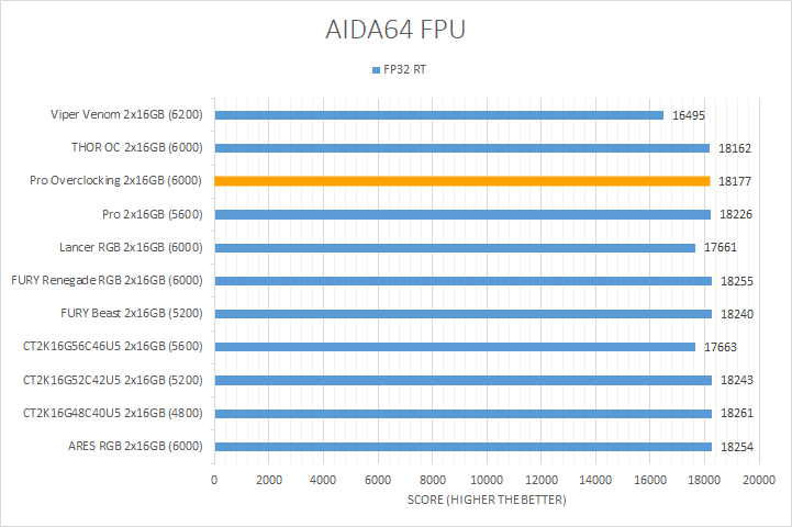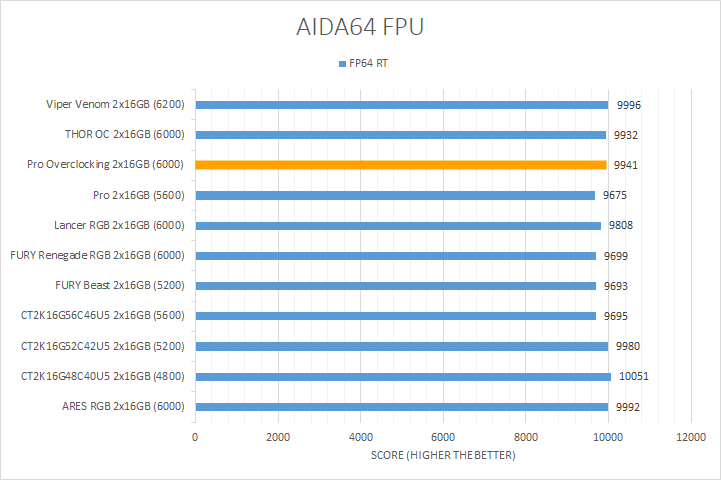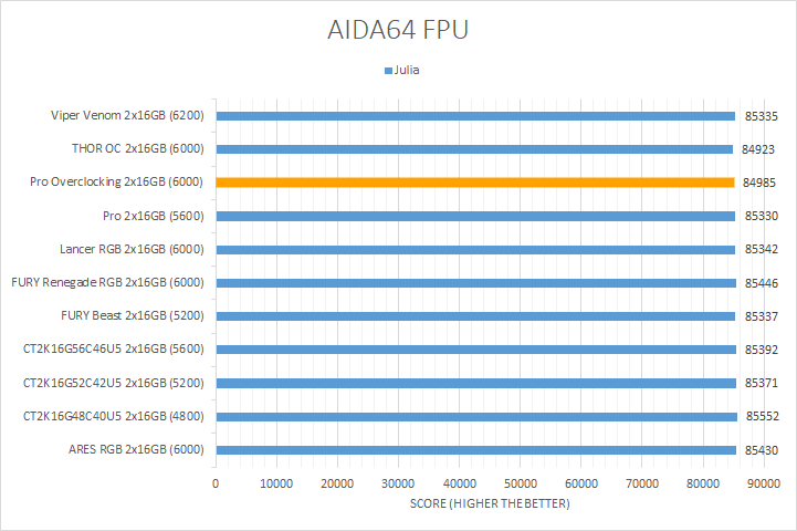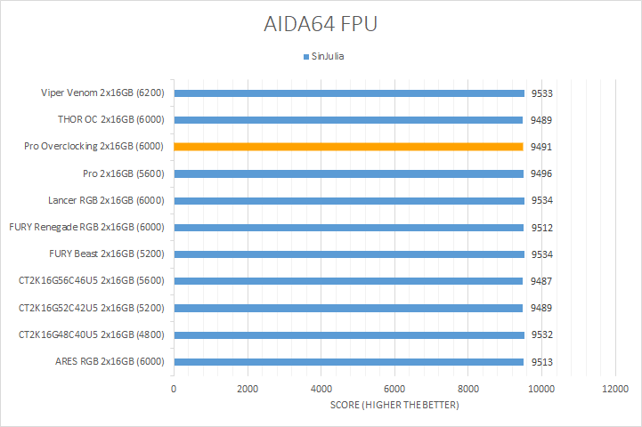 In our second set of AIDA64 tests, the FPU benchmarks, the results typically do not vary much as they are more influenced by the processor. This trend held true for the first three tests, where there was minimal variance observed across all of the tested kits. The Crucial Pro Overclocking DDR5-6000 2x16GB performed similarly to other kits in these tests, although it was still numerically towards the bottom. However, the floating point 32 and 64 ray tracing tests showed a bit more variability. Here, the Crucial Pro Overclocking was close to the middle for both of these tests. Overall, the results fell within the expected range for DDR5 memory, with the Crucial Pro Overclocking modules demonstrating performance consistent with its specifications.