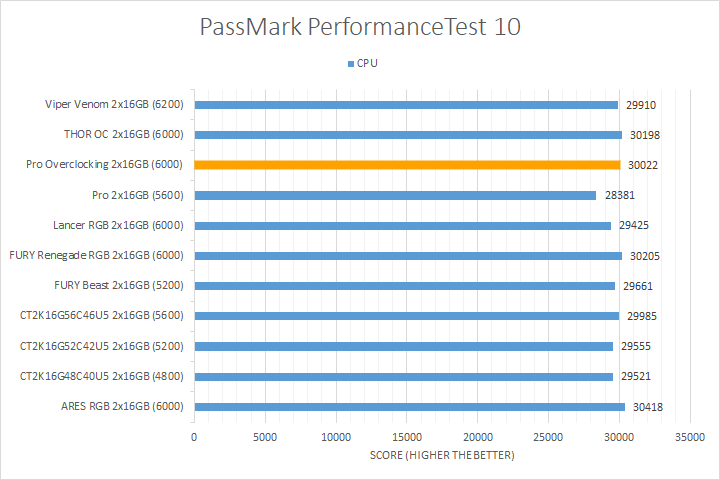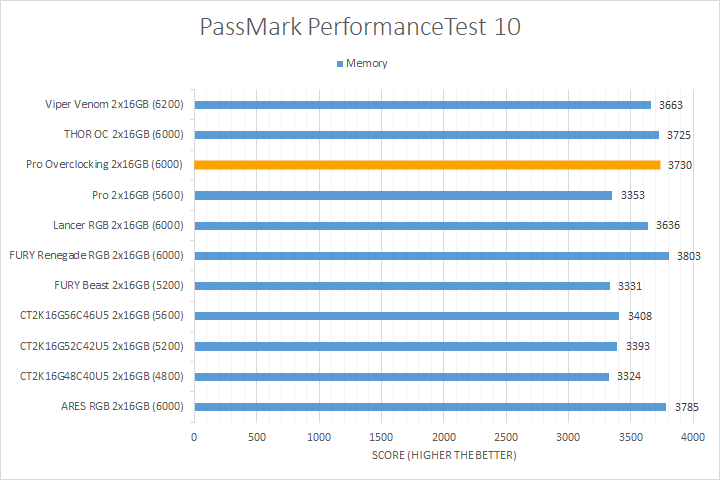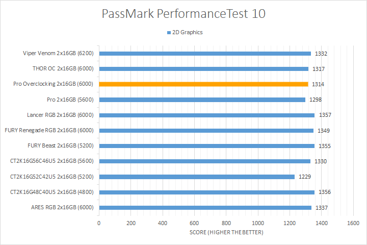 PassMark PerformanceTest 10 is another valuable tool for evaluating various aspects of system performance, including CPU, RAM, 2D Graphics, and 3D Graphics. It takes a unique approach in obtaining results compared to other programs, making it a good supplementary benchmarking program. PassMark Performance Test 10's memory benchmarking tool is the only test in our setup that takes memory capacity into account. However, since all the kits assessed are 32GB in total capacity, this point becomes irrelevant. The memory benchmarks did account for the differences in data transfer rates. The performance from the Crucial Pro Overclocking aligned with the results from other tests, with slightly better results than the Lexar THOR OC in its speed class. In the CPU tests, it ranked in the middle, while the 2D Graphics showed lower numbers. It did put up the best numbers in the 3D Graphics test, but we have not seen a strong correlation between the tested memory and the 3D Graphics test in the past.