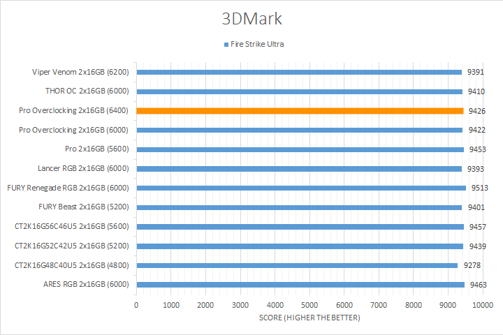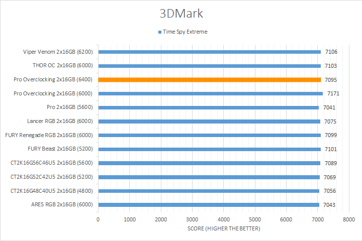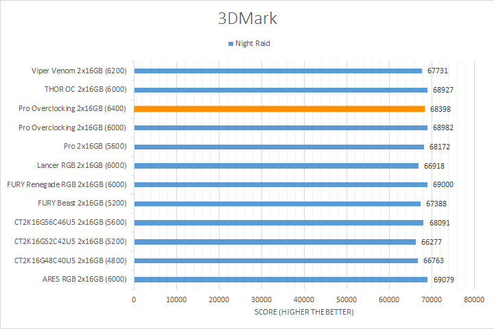 Similar to UL's PCMark 10, 3DMark is another favorite among enthusiasts and reviewers alike. In fact, it has been part of the APH Networks' battery of standard benchmarks since the very beginning. The latest version of 3DMark offers a variety of presets, including Port Royal for real-time ray tracing, Time Spy Extreme for 4K gaming with DirectX 12, Fire Strike Ultra for 4K gaming with DirectX 11, and Night Raid for DirectX 12 testing on systems with integrated graphics. From the graphs above, it is evident all of the kits were close regardless of the memory bandwidth. The largest difference was observed in the Night Raid test, with a 4% difference from the highest to the lowest score. However, this variance was not surprising, as these tests are more reliant on the GPU used in testing. Our Crucial Pro Overclocking DDR5-6400 remained competitive in its results, scoring anywhere from mid-pack to near the top in all four tests.