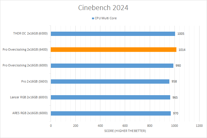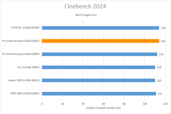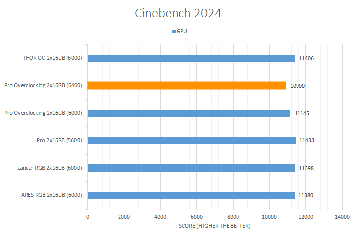Cinebench 2024, Maxon's latest benchmark, measures both CPU and GPU rendering performance. The CPU tests include scenarios for utilizing only one core and all available cores. Obviously, having a fast CPU or GPU will play a primary role in determining these scores, the memory still plays a role in these results. As you can see in our charts above, the Crucial Pro Overclocking DDR5-6400 was tied for or in first place for both of the CPU tests. In the GPU test, it performed less favorably as the lowest performing memory kit.