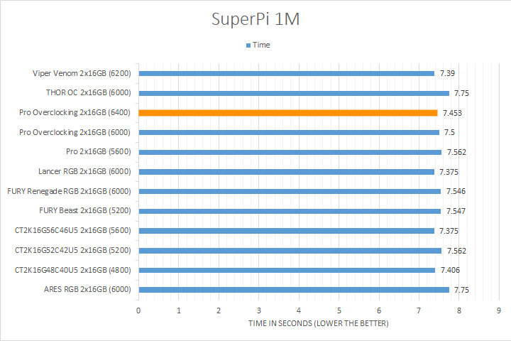 Including SuperPI in benchmark results has been a longstanding tradition because it provides a quick and straightforward assessment that can be intriguing. While SuperPI is not the fastest method for calculating Pi nor the most demanding, it remains popular among enthusiasts for showcasing overclocking achievements on various platforms. In this instance, the Crucial Pro Overclocking DDR5-6400 modules performed in the middle of the pack, securing the sixth fastest time out of twelve kits tested.