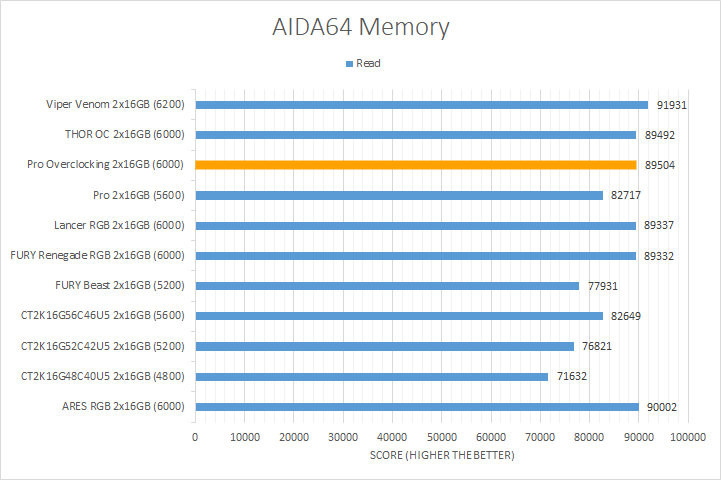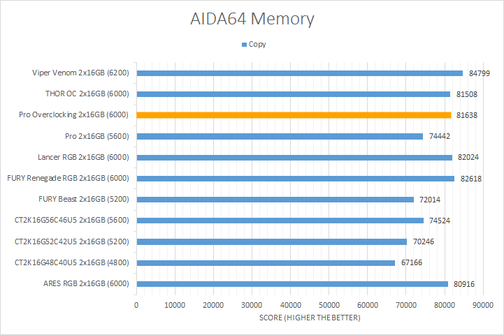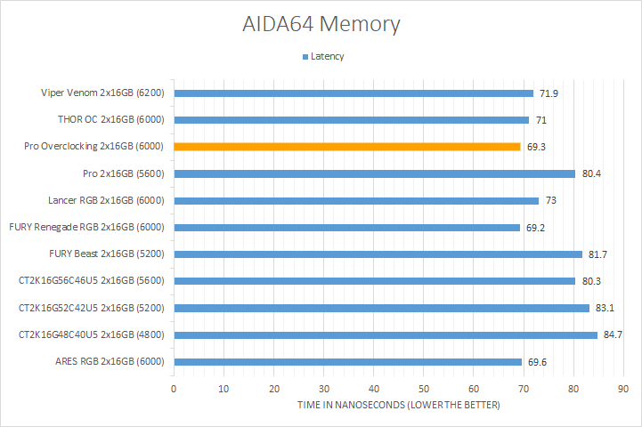 In our third set of AIDA64 synthetic tests, we have the memory benchmarks. Traditionally, higher memory bandwidth RAM kits are favored, whether it is the Copy, Write, or Read results. Operating at DDR5-6000, the Crucial Pro Overclocking White performed exactly as anticipated. It essentially tied with other kits operating at the same speed, which was unsurprising. It lagged slightly behind in the Write and Copy tests compared to its competition, but was still markedly faster than the competition operating at slower speeds. Compared to the Crucial Pro, the Overclocking variant provided better numbers, which is as expected given the difference between the operating speeds. Regarding latency, the Crucial Pro Overclocking White DDR5-6000 2x16GB kit delivered nearly the best results of 69.3ns, trailing only behind the Kingston FURY Renegade DDR5-6000.