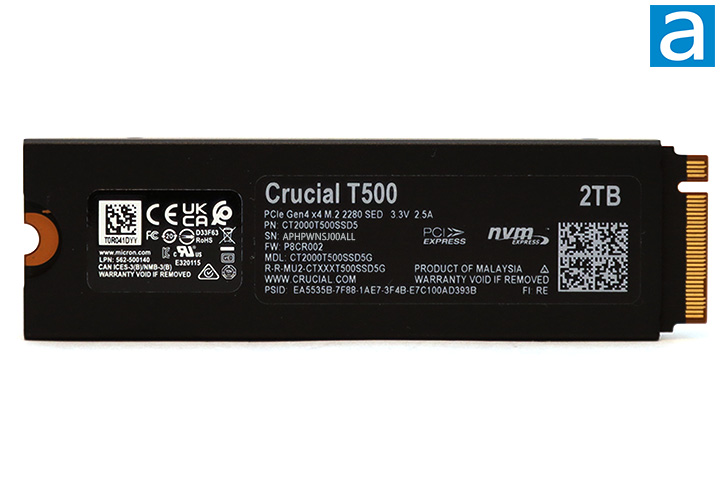 Flipping the Crucial T500 2TB around and you will see the back of the wraparound heatsink. The labels on this side of the Crucial T500 SSD carry miscellaneous information such as its model name, capacity, serial number, and regulatory certifications. This SSD is assembled in Malaysia, which is the same as the P5 Plus 2TB.