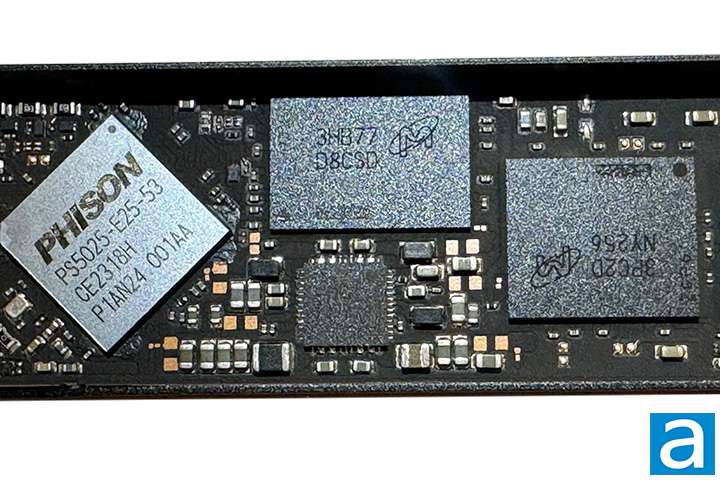 You can see what the Crucial T500 2TB is made from after removing the heatsink. There are three different components that can be seen, all located on the same side. At the heart of Crucial's T500 2TB is a Phison 5025-E25 controller, as opposed to the custom controller found on the P5 Plus. It is an NVMe solution on the M.2 socket to utilize the bandwidth afforded by the PCIe 4.0 standard. The controller also has native full drive encryption support. A Micron D8CSD, decoded as MT53E512M32D1ZW-046, LPDDR4-2133 2GB memory chip is present. It is used by the controller for system memory.